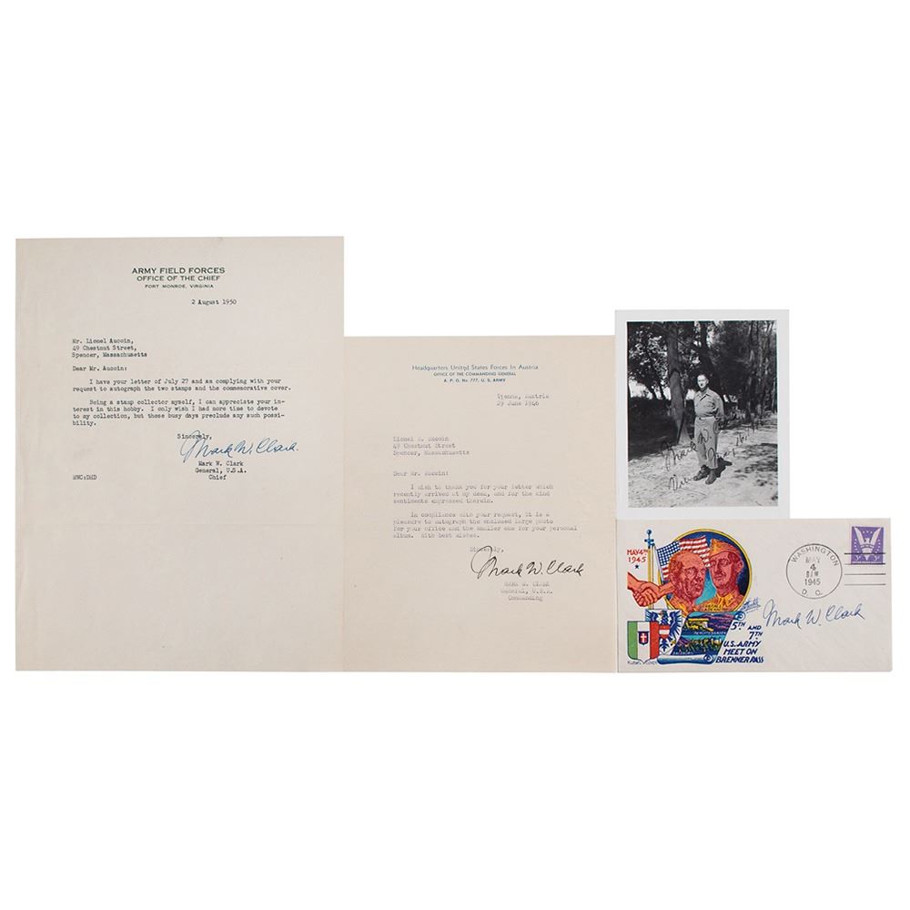 Four items signed by Clark: a vintage glossy 4 x 5 photo, marked "Secret" on the reverse, signed in fountain pen, "Mark W. Clark, Vienna—May 16, 1946"; a commemorative cover honoring the German surrender, signed in fountain pen; a TLS, one page, Headquarters United States Forces in Austria letterhead, June 29, 1946, responding to an autograph request; and a TLS, one page, Army Field Forces letterhead, August 2, 1950, complying with an autograph request. In overall fine condition.
