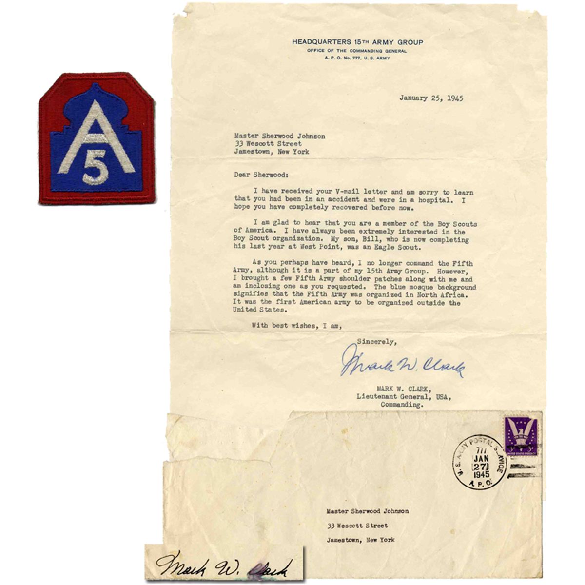 Mark W. Clark typed letter signed with cover on ''Headquarters 15th Army Group'' stationery. 25 January 1945 letter to Sherwood Johnson reads: ''I glad to hear that you are a member of the Boy Scouts of America, no longer command the Fifth Army, brought a few Fifth Army shoulder patches along with me and am inclosing [sic] one as you requested.'' 8'' x 10.5'', one page. Slightly toned cover is also signed by Clark. Accompanied by one patch, in mint condition. Minor toning and ''C'' to Clark's signature slightly smudged. Very good condition.