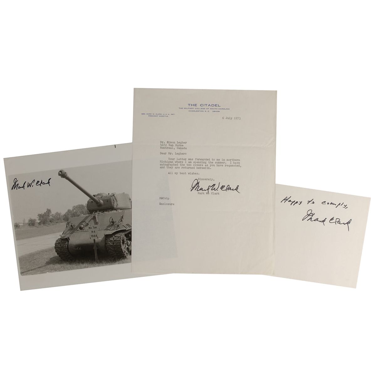 Three items: TLS signed “Mark W. Clark,” on personal Citadel letterhead, 8.5 x 11, July 6, 1973, in which Clark responds to a collector’s request; a felt tip signature, “Happy to comply, Mark Clark,” on a white 8.5 x 5.5 sheet; and a glossy 10 x 8 photo of a WWII tank, signed in black felt tip, “Mark W. Clark.” In fine condition.