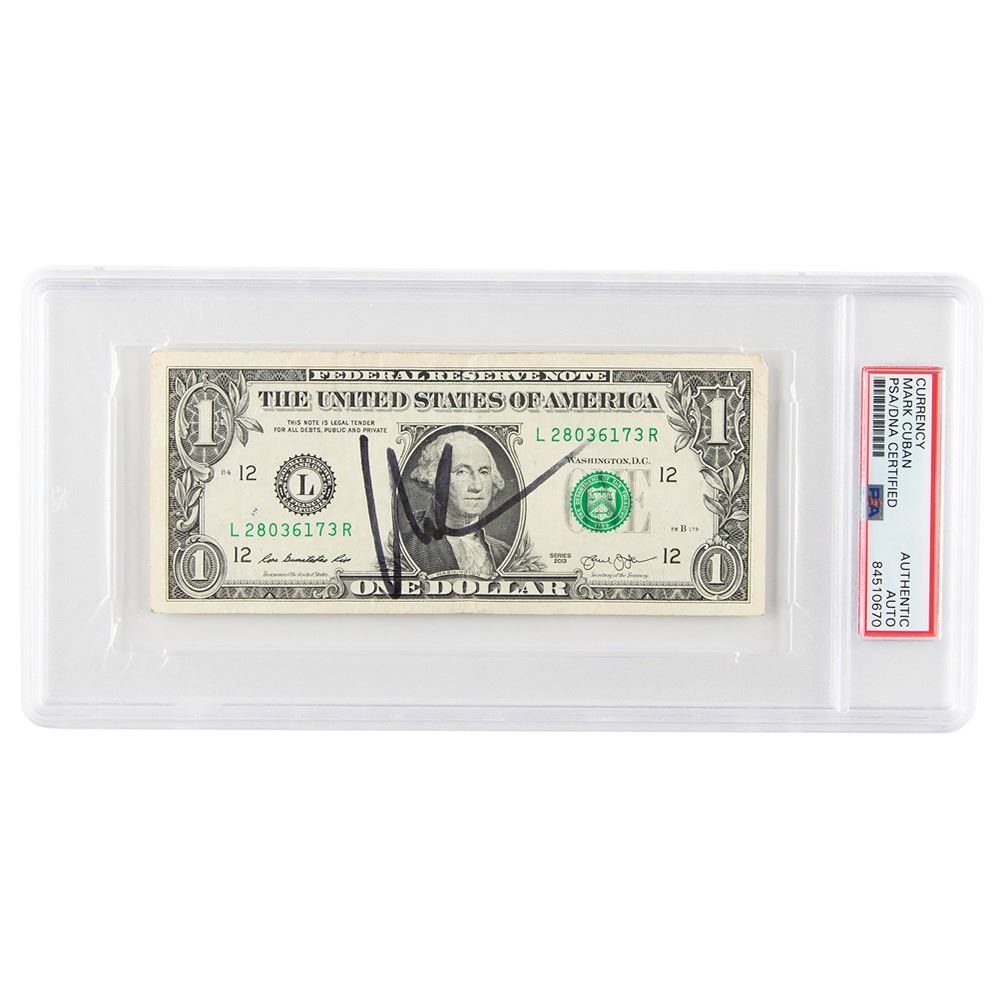 Series 2013 one-dollar bill, signed in black felt tip by Mark Cuban. In fine condition. Encapsulated in a PSA/DNA authentication holder. A desirable signed format for the Shark Tank investor and the owner of the Dallas Mavericks, whose net worth orbits around $5 billion.
