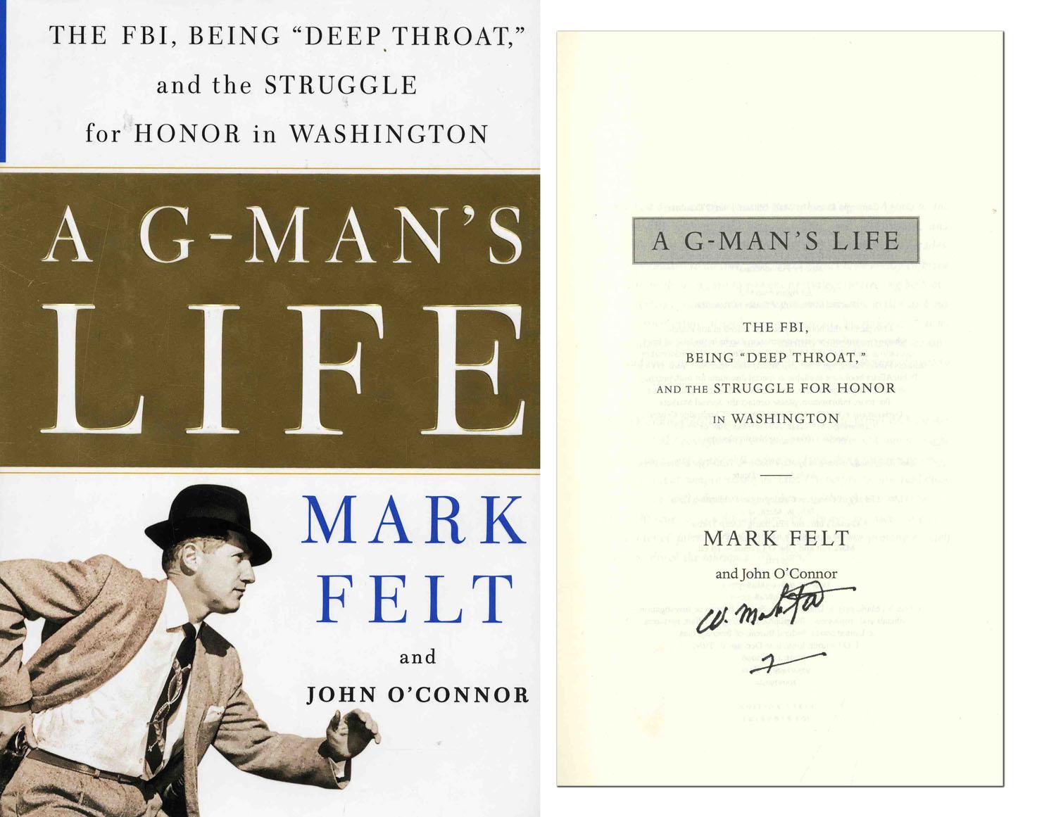 Excellent first edition, first printing copy of famed Watergate whistle-blower Mark Felt, aka ''Deep Throat'' signed autobiography, ''A G-Man's Life,'' which details his time at the FBI and his experience in the Watergate probe. Public Affairs: New York: 2006. Boldly signed on copyright page ''W. Mark Felt''. With original dustjacket, including unclipped ''$26.95'' price intact. Hardcover book measures 6.5'' x 9.5'' and is in fine condition.