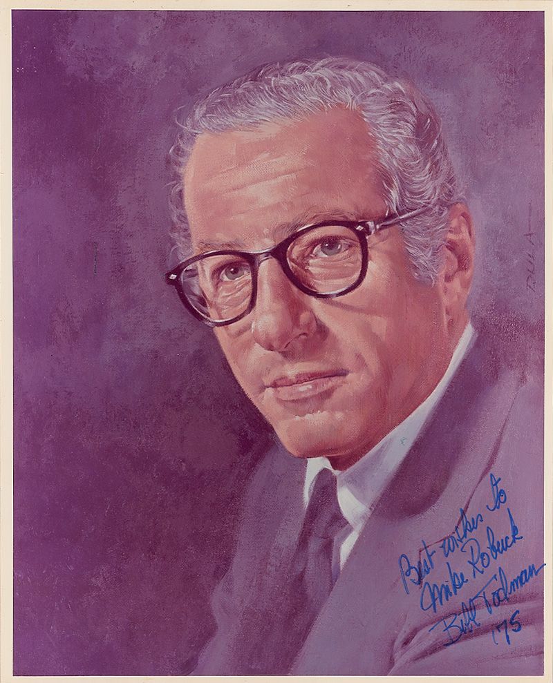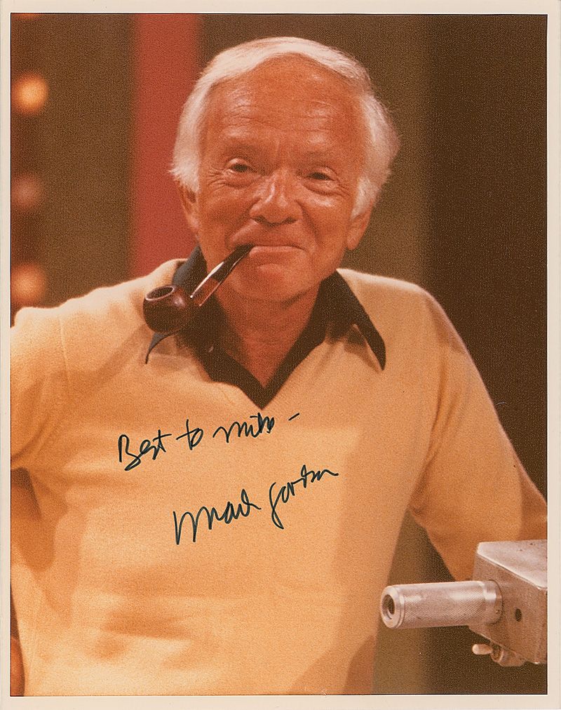 Two items: color satin-finish 8 x 10 photo of Goodson smoking a pipe, signed and inscribed in black felt tip, “Best to Mike—Mark Goodson;” and a color glossy 8 x 10 photo of a painted portrait of Todman, signed and inscribed in blue felt tip, “Best wishes to Mike Robuck, Bill Todman, ‘75.” In fine condition, with scattered dings and impressions.