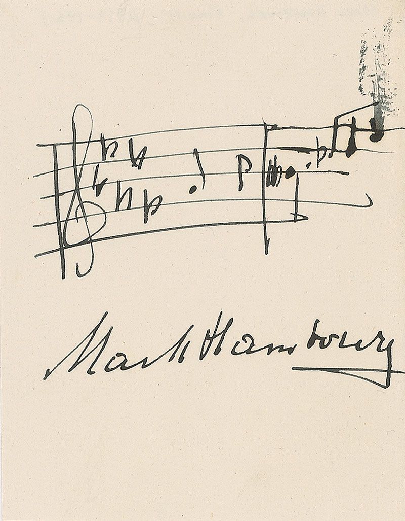 Russian-British concert pianist (1879–1960). AMQS on an off-white 3.5 x 4.5 card. Hambourg pens two bars from one of his works in B-flat minor, boldly signing below. In fine condition.