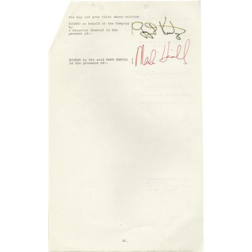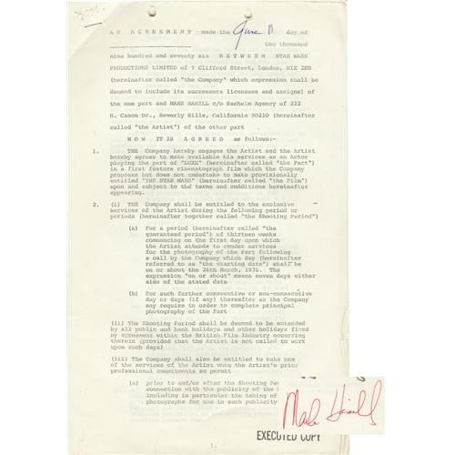 <B>Mark Hamill Signed "Star Wars" Contract.</B></I> A 22-page agreement between Mark Hamill and Star Wars Production Limited dated June 11, 1976, engaging Hamill for a historic role. It reads in part: "The Company hereby engages and the Lender hereby agrees to make available his services as an actor playing the part of 'Luke' in a first feature cinematograph... entitled 'The Star Wars'", and stating his salary to be $13,000 payed in 13 weekly installments. It is signed on the last page in red ink by Hamill, and is in Very Fine to Excellent condition with light wear and staple and binder holes along the top edge. <I>Accompanied by LOA from PSA/DNA.</B></I><BR><BR><b>Shipping:</b> Small Flat (<a target="_blank" href="http://www.heritageauctions.com/common/shipping.php">view shipping information</a>)