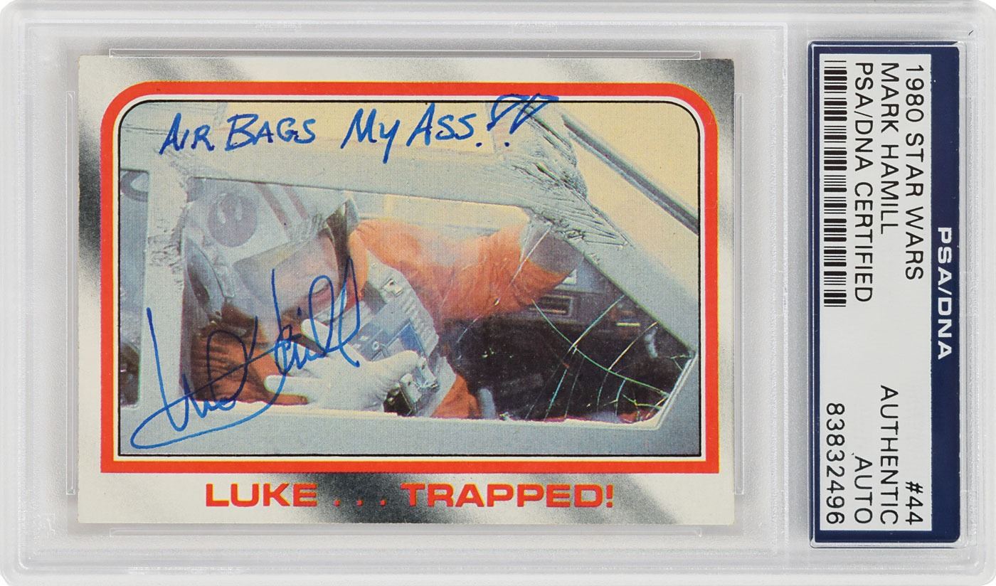 Fantastic 1980 Topps Star Wars trading card for The Empire Strikes Back, 3.5 x 2.5, No. 44, showing Luke Skywalker attempting to free himself from his crashed spacecraft on the ice planet Hoth, entitled: "Luke…Trapped!" Signed on the front in blue ink, "Airbags my ass!! Mark Hamill." Encapsulated in a plastic PSA/DNA authentication holder. In very fine condition.