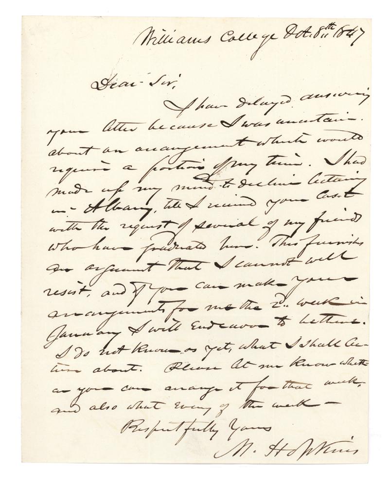 MARK HOPKINS (1802-1887) American educator and theologian who served as president of Williams College. Autograph Letter Signed, “M. Hopkins.” One page, 7 1/4” x 9 1/4”. Williams College. October 8, 1847. Hopkins writes, in part: “ …I had made up my mind to decline lecturing in Albany till I received your last with the request of several of my friends who have graduated there. This furnishes an argument that I cannot well resist, and if you can make your arrangements for me the 2nd week in January I will endeavor to be there. I do not known as yet, what I shall lecture above. Please let me know whether you can arrange it for that week … ” Usual folds. Overall Very Fine.