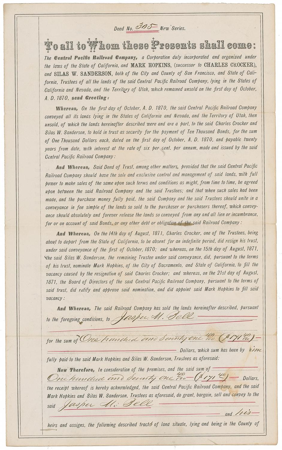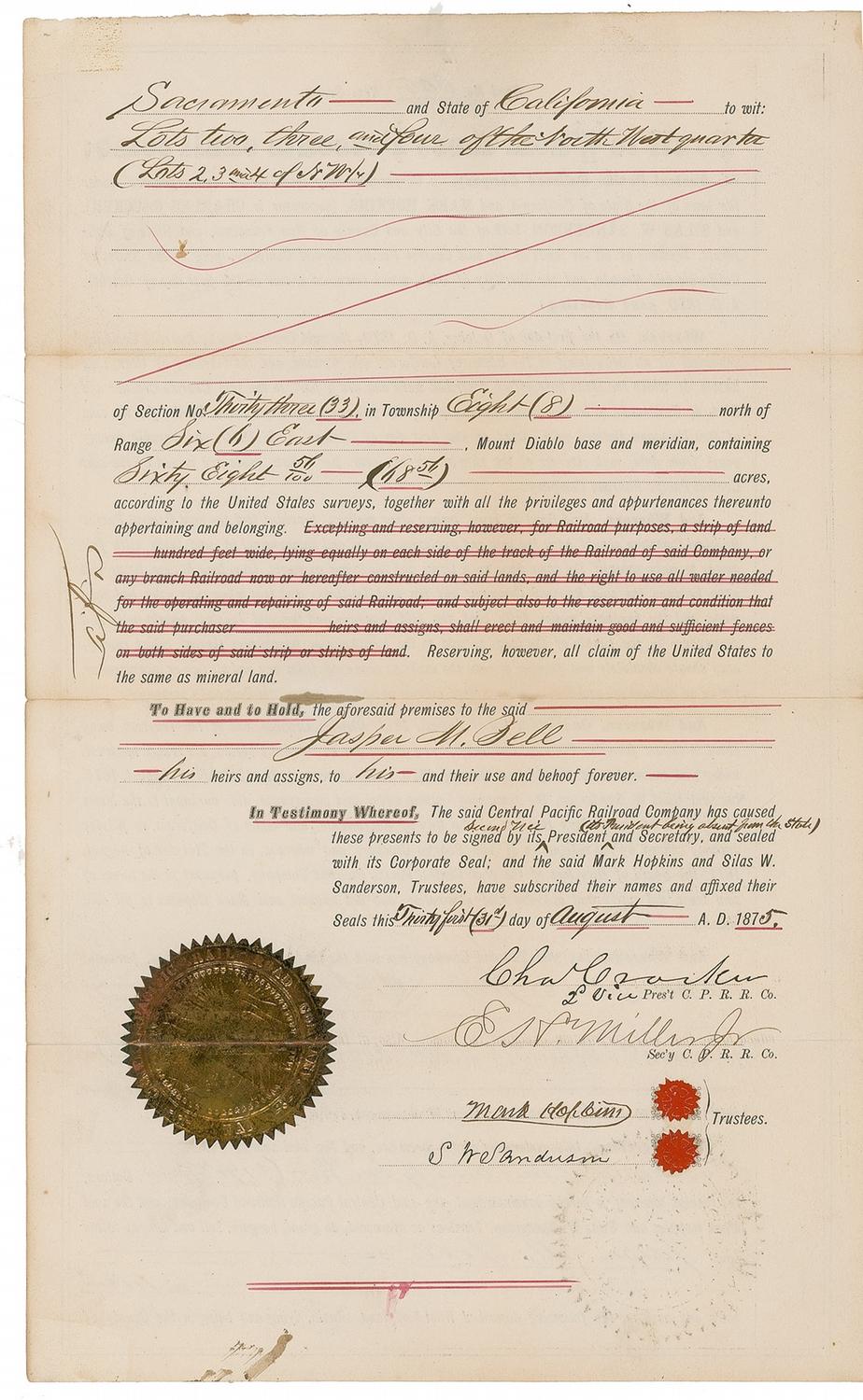 Mark Hopkins signed 1875 Central Pacific land deed. Partly-printed DS, signed by Mark Hopkins and Charles Crocker (signed “Cha. Crocker”), one page both sides, 8.5 x 13.75, August 31, 1875. Central Pacific Railroad Company land sale deed transferring CPRR land to Jasper M. Bell. In part: “The said Railroad Company has sold the lands hereinafter described, pursuant to the foregoing conditions, to Jasper M. Bell for the sum of One hundred and seventy one 40/100 ($171.40) Dollars, which sum has been by him fully paid to the said Mark Hopkins and Silas W. Sanderson, Trustees as aforesaid.” An adjacent page bears a State of California notary public signature and stamp with deed docketing on the reverse. In very good condition with areas of separation along the vertical hinge, wrinkling, scattered toning and soiling, and mirroring of a gold foil seal under Hopkin’s signature.