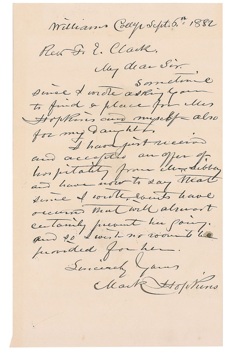 Inspired teacher and lecturer (1802–1887), the author of many books on morality and religion. ALS, one page, 5 x 8, September 6, 1882. Letter to Reverend F. E. Clark regarding housing for his family. In part: “I have received and accepted an offer of hospitality from Mr. Sibbey.” In fine condition, with uniform mild toning.