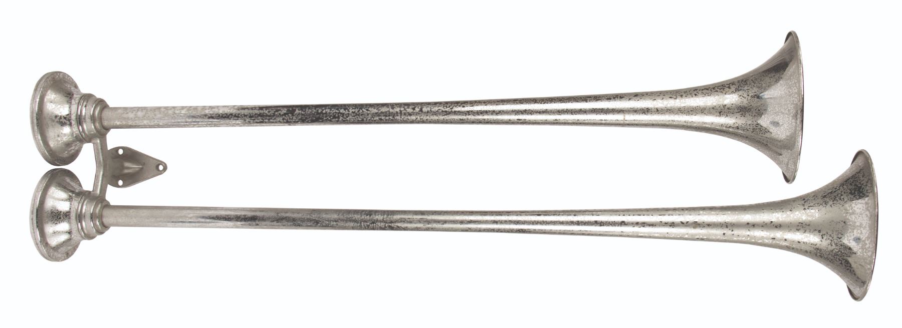 (Walt Disney World, c.1971-80s) An original dual air horn used by Walt Disney World's Mark IV Monorail Blue. The Mark IV Monorail Blue train began its service September 20, 1971, and has the distinction of being retired early to be used in creating prototypes for the Mark VI, which was introduced in 1989. This original metal air horn was created by Grover Products Co and the two horns measure 34" and 37" long. The condition is good overall, with some wear throughout from its original use as well as tarnishing throughout the metal from age.
