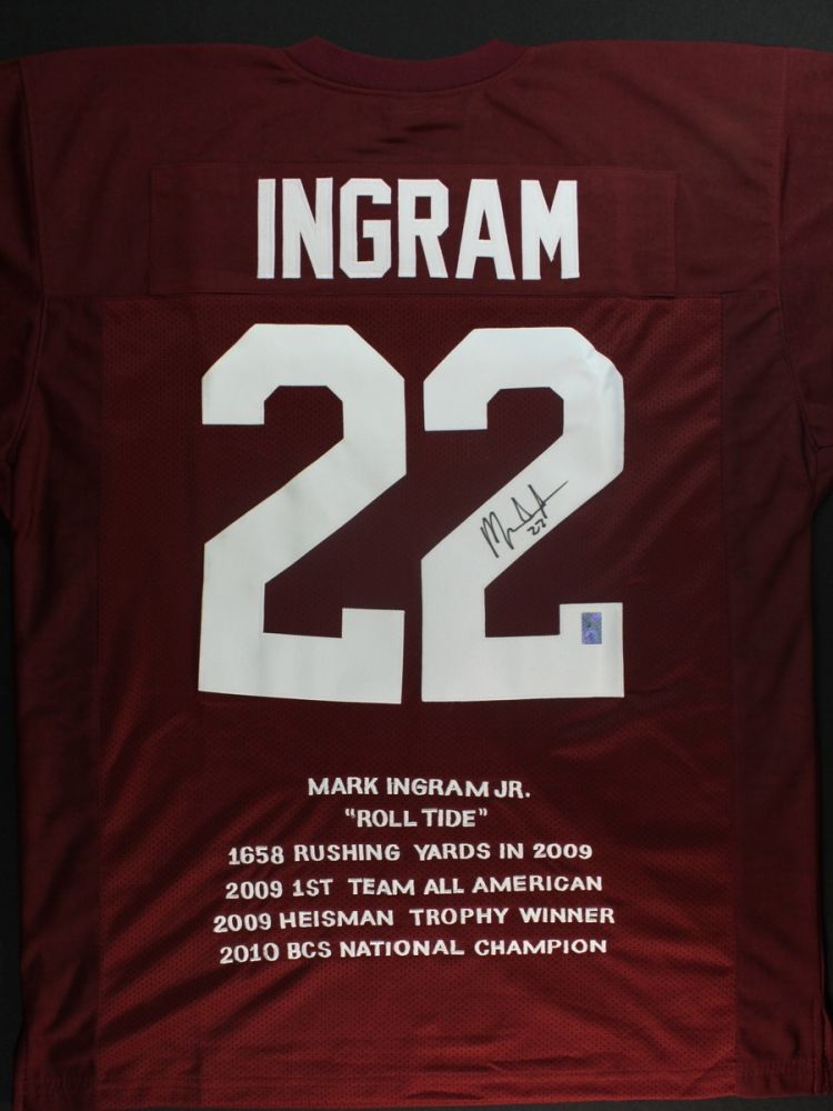 On-field style jersey. Everything is sewn on, size XL. Hand-signed in black felt tip pen by Mark Ingram (Saints). Ingram's college stats are custom stitched into the jersey below the reverse numbers. The autograph includes an official Mark Ingram player hologram for authentication purposes.