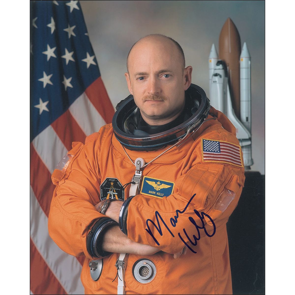 Two identical color glossy 8 x 10 photos of Kelly in his orange space suit before an American flag and a shuttle model, each signed in black felt tip. In fine condition. Accompanied by two photocopied photos taken at time of signing.