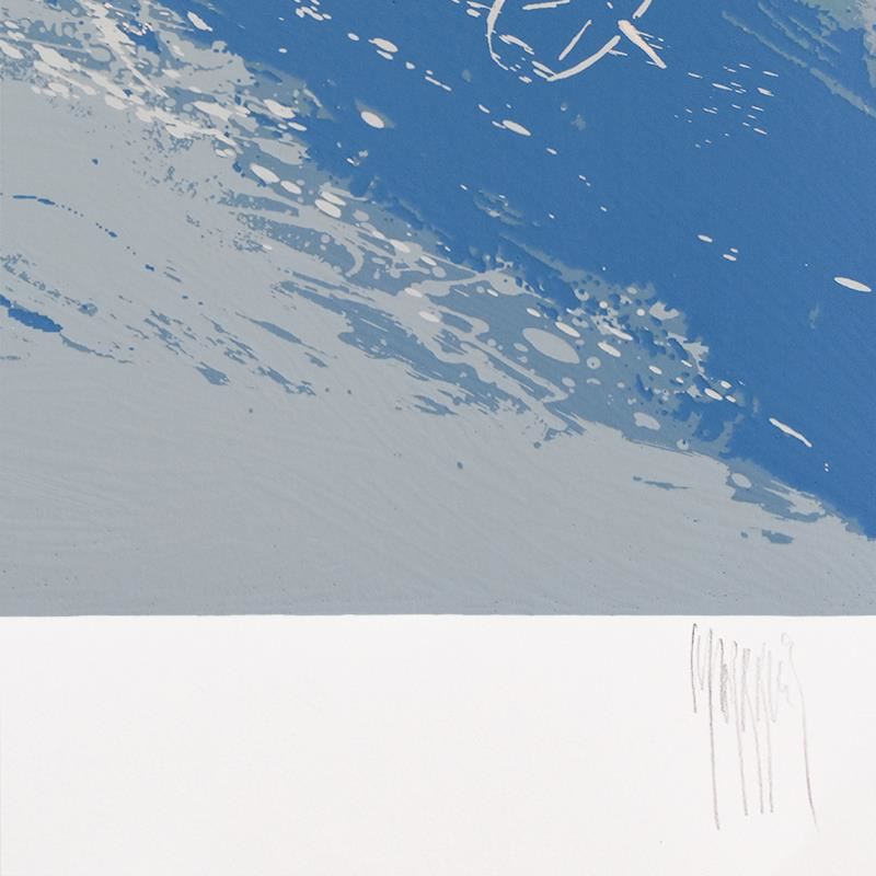"Back Bowls Skier" is a limited edition serigraph on paper by Mark King (1931-2014), numbered and hand signed by the artist. Includes Letter of Authenticity. Measures approx. 45" x 35" (border), 40" x 30" (image). Please note: due to the age of this piece there is minor wear in the white border area.