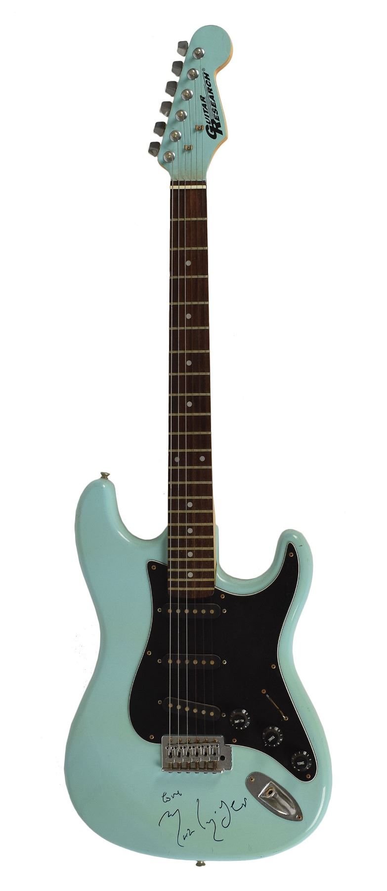 Aqua-bodied Guitar Research stratocaster-style electric guitar, signed on the body in black felt tip, "Love, Mark Knopfler." In fine condition, with a few nicks and scuffs to body; adhesive remnants to reverse in no way affect display value. Accompanied by a black Fender gig bag. Originally obtained by in-person specialist Mike Wehrmann.