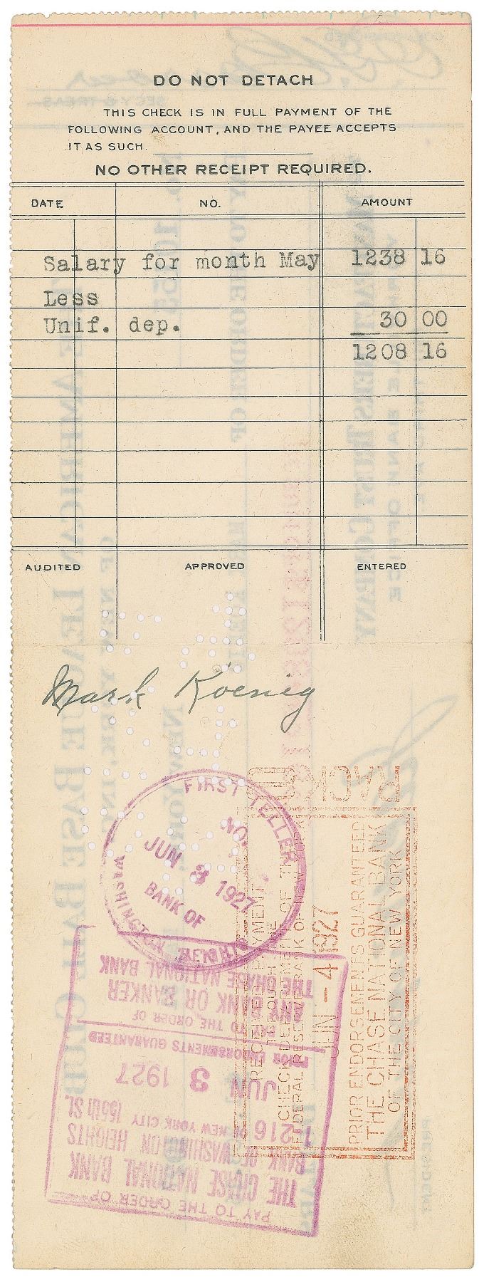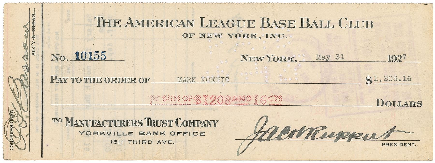 The American League Base Ball Club of New York check, 9 x 3.25, filled out in type and signed by Ruppert, "Jacob Ruppert," and vertically countersigned by Barrow, "E. G. Barrow," payable to Mark Koenig for $1208.16, May 31, 1927. Endorsed on the reverse in fountain pen by Koenig, "Mark Koenig." The check covers Koenig's salary for the month of May, minus a $30 uniform deposit. In fine condition. A superb thrice-signed Yankees paycheck from an iconic season, featuring the team's Hall of Fame owner and general manager, plus the rangy shortstop of their famous 'Murderer's Row.'