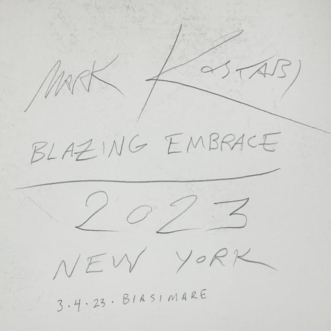 "Blazing Embrace" is an original mixed media painting on paper by Mark Kostabi, hand signed by the artist. The piece comes framed. Includes Certificate of Authenticity. Measures approx. 35.5" x 48" (frame), 29.5" x 42" (image).