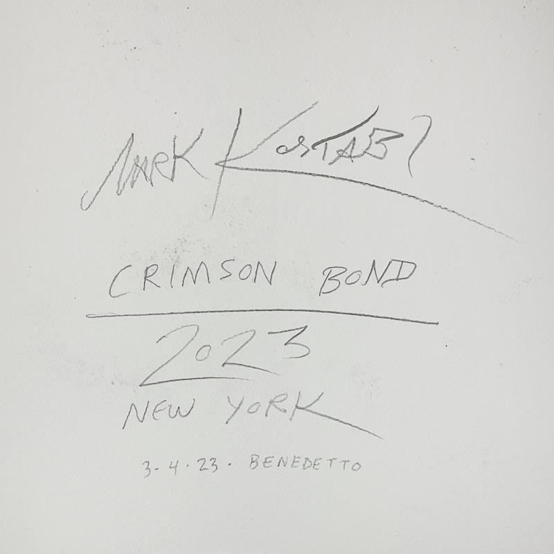"Crimson Bond" is an original mixed media painting on paper by Mark Kostabi, hand signed by the artist. The piece comes framed. Includes Certificate of Authenticity. Measures approx. 35.5" x 48" (frame), 29.5" x 42" (image).