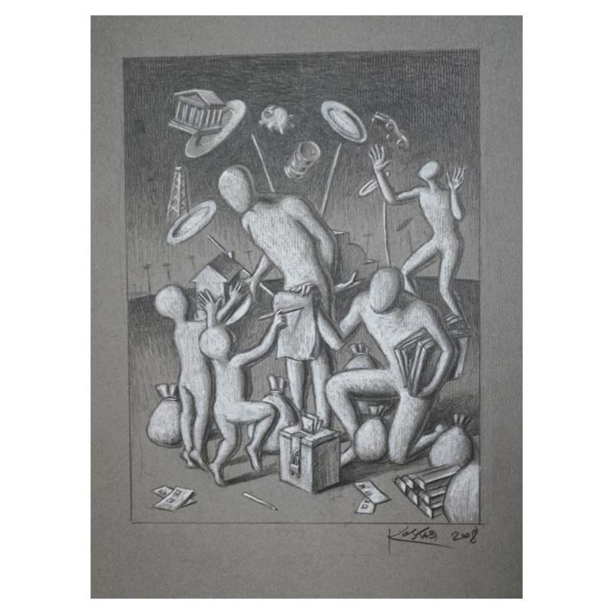 "Infant Democracy" is an original artwork, pencil on paper, by Mark Kostabi. The piece is hand signed and comes with a certificate of authenticity. Measures approximately13.5" x 10". Reference #: 247054