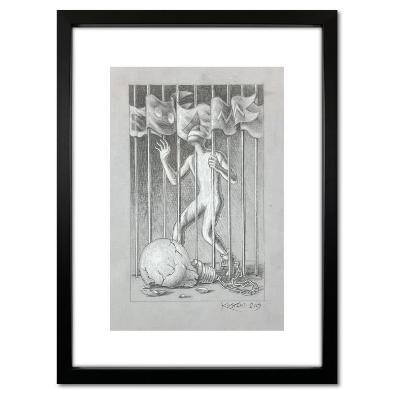 "The Diplomat" is an original drawing on paper by Mark Kostabi, dated 2009 and hand signed by the artist. This piece comes custom framed. Includes Certificate of Authenticity. Measures approx. 14" x 18" (frame), 8.5" x 13" (image).