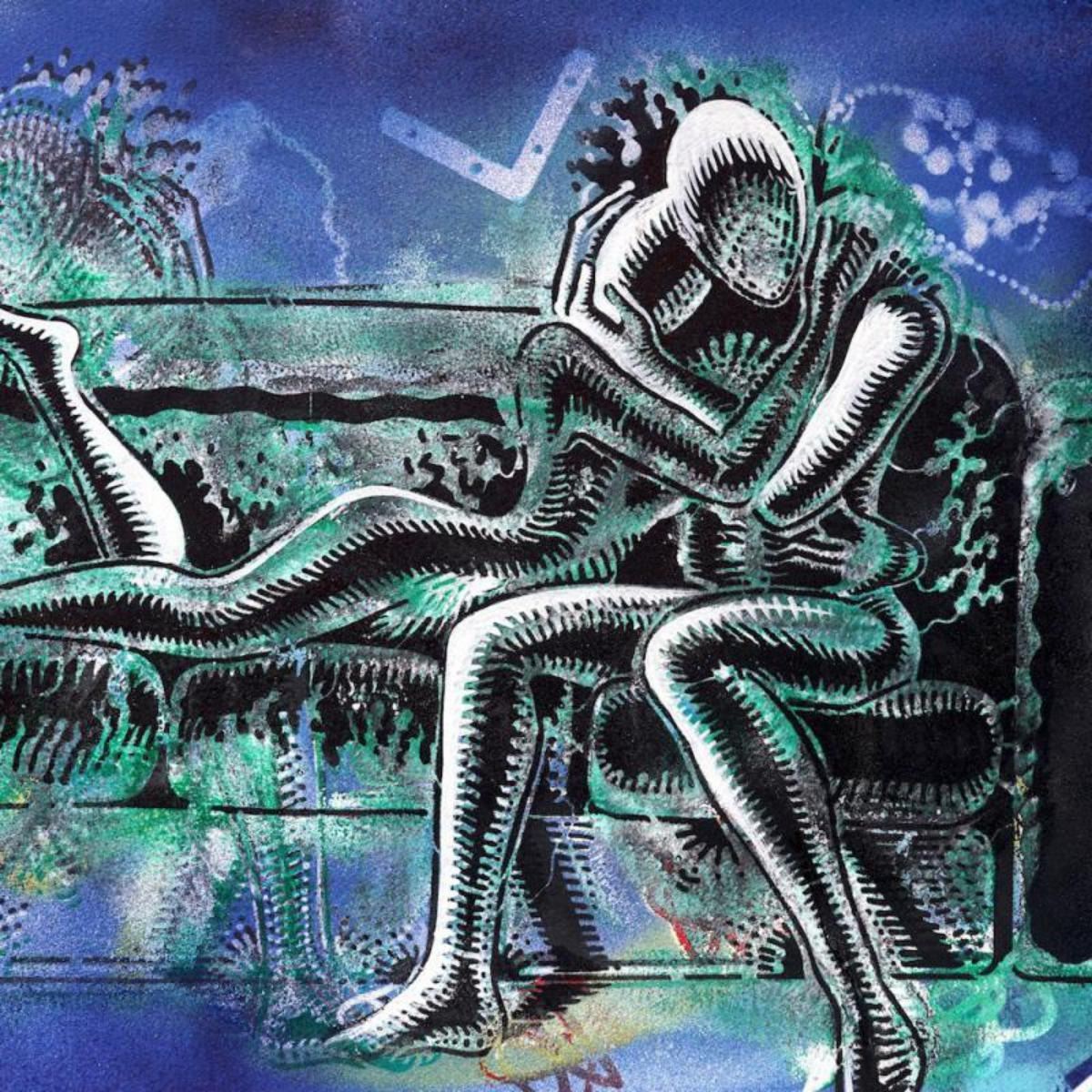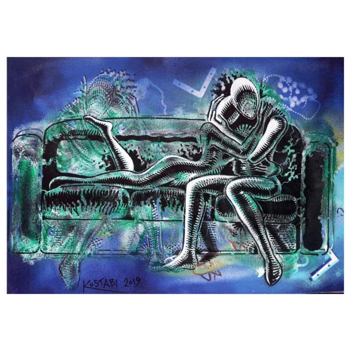 "The Stroke Of Midnight,2019" is a mixed media original painting on paper, by Mark Kostabi. The piece is hand signed and comes with a certificate of authenticity. Measures approximately 29.5" x 42". Reference #: 236298