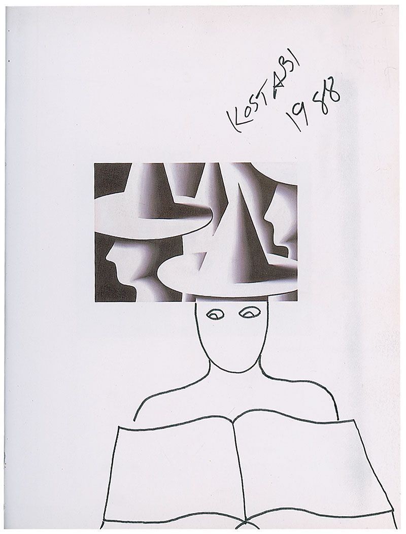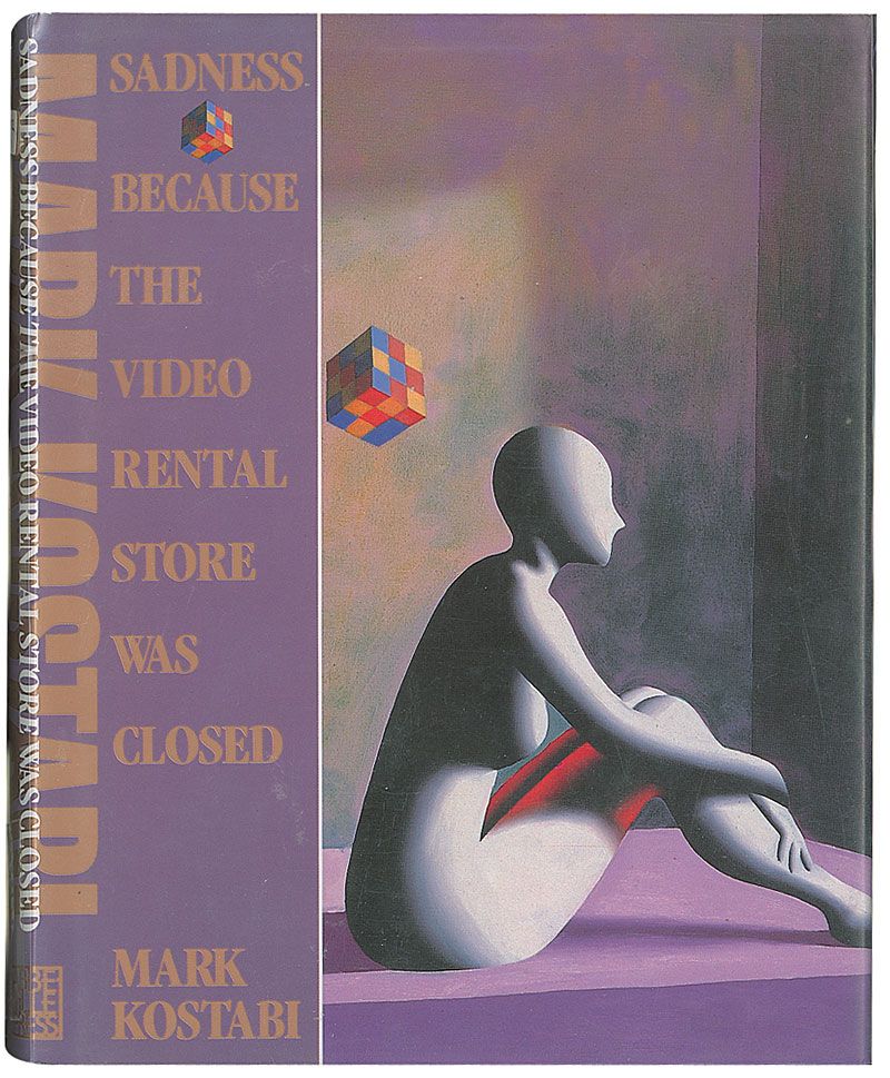 Signed book: Sadness Because the Video Rental Store Was Closed. NY: Aberville Press, 1988. Hardcover with dust jacket, 7 x 8.75, 176 pages. Kostabi has drawn a black felt tip sketch of a person reading a book below one of his works on the first page, sign