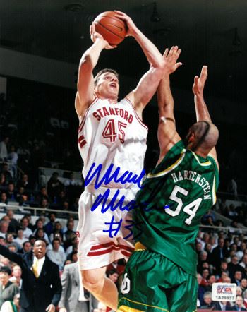 Mark Madsen played NCAA basketball at Stanford, where he finished his career ranked in the school's career top 10 in blocks and rebounds. In addition, Madsen helped the Cardinal to four NCAA tournament appearances, including a Final Four berth in 1998. Perhaps his signature moment at Stanford was his dunk and free throw that gave Stanford a lead over Rhode Island, propelling the team into the Final Four, where it lost to eventual champion Kentucky. Madsen was a two-time All-American and a two-time All-Pac-10 selection. Mark Madsen has hand signed this Stanford Cardinal 8x10 Photo. PSA hologram and Certificate of Authenticity.