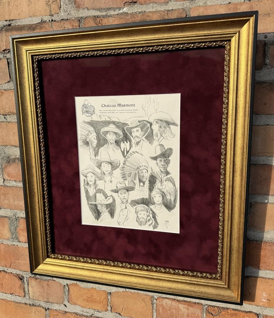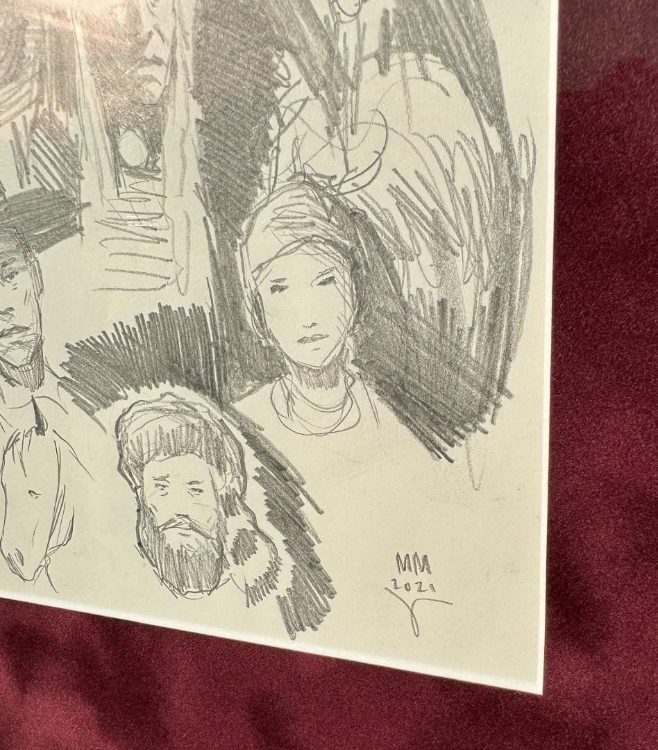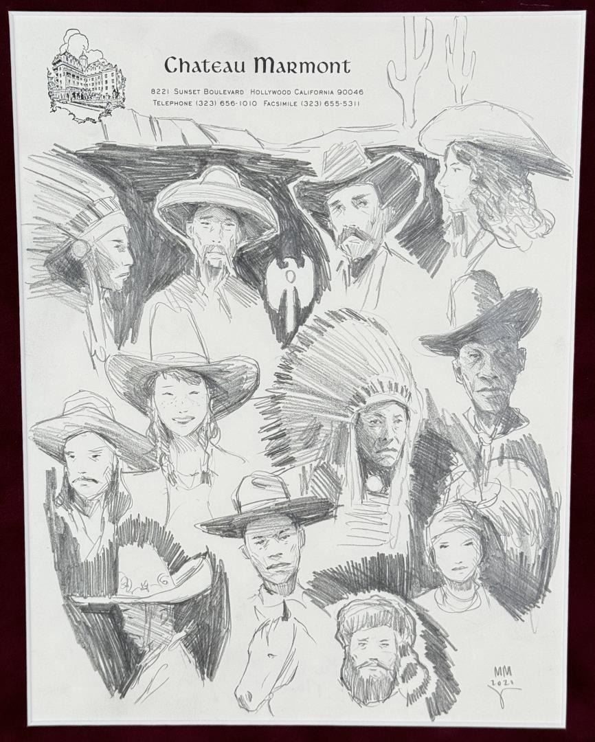 Title is: Faces of the Old West, dated 2021. Pencil on paper. A very nice and busy example of the artists sketchbook work. Drawn on the Chateau Marmont Hotel stationery of Hollywood California. Measures 20 1/4" by 18" framed. Measures 10 3/4" by 8 1/4" unframed. Mark Maggiori, b. 1977. Live in Los Angeles, California Mark Maggiori’s first views of America were framed within the front windshield of a car making its way from New York to San Francisco. That month-long trip, filled with majestic views of the national parks and timeless glimpses of the West, was made when Mark was only 15 years old and on vacation far from his home in France, but its impact would ripple throughout his life and set into motion his great fascination with the West. Years later, back in Paris, he would enroll at the famous Academie Jullian, where Western greats Ernest L. Blumenschein, Burt Geer Phillips and Joseph Henry Sharp had also studied before they helped form the Taos Society of Artists. After being formally trained in academic drawing, Mark’s life would take an important detour through music after he formed a successful band that led to many opportunities in Europe, including into other artistic disciplines such as animation, photography and film making—each one informing his artistic creativity in unique ways. After great success in the music industry, Mark was lured back to the United States thanks to his muse, creative equal and wife Petecia Lefawnhawk. They journeyed through the West and their trips immediately took him back to that original road trip two decades earlier, the trip that opened his eyes to the beauty of American West. It was then, at the age of 36, he made the decision to paint Western art. They staked temporary claims in out-of-the-way places such as Chloride and Kingman, Arizona, where the desert offered its stunning inspiration and where Mark quickly began to produce some of the most audacious Western paintings of a new generation—audacious because Mark was still brand new to the Western art world, and also because he was an outsider, a Frenchman, with a profoundly unique view of the American cowboy. In the space of just a few short years Mark rose through the ranks to become one of the premier Western artists working today. His work brought many new opportunities, including important solo and group shows, and a significant showing at the 2017Night of Artists at the Briscoe Western Art Museum, where he won the Sam Houston award. He also began to expand more artistically: he started to work more in plein air, he spent time on ranches with cowboys and on horseback to acquaint himself more with the Western way of life. He spent time in New Mexico, Arizona and Wyoming and began adding additional figures to his works and new kinds of compositions to his growing arsenal. Like Henry Farny, another Frenchman who made his way to the Southwest to paint its interesting inhabitants, Mark has carved a unique place for himself within Western art, a place where his work—part Frank Tenney Johnson, part Herbert "Buck" Dunton, with shades of Tom Ryan and Bill Owen—continues to provoke the minds of young and old Western collectors alike.