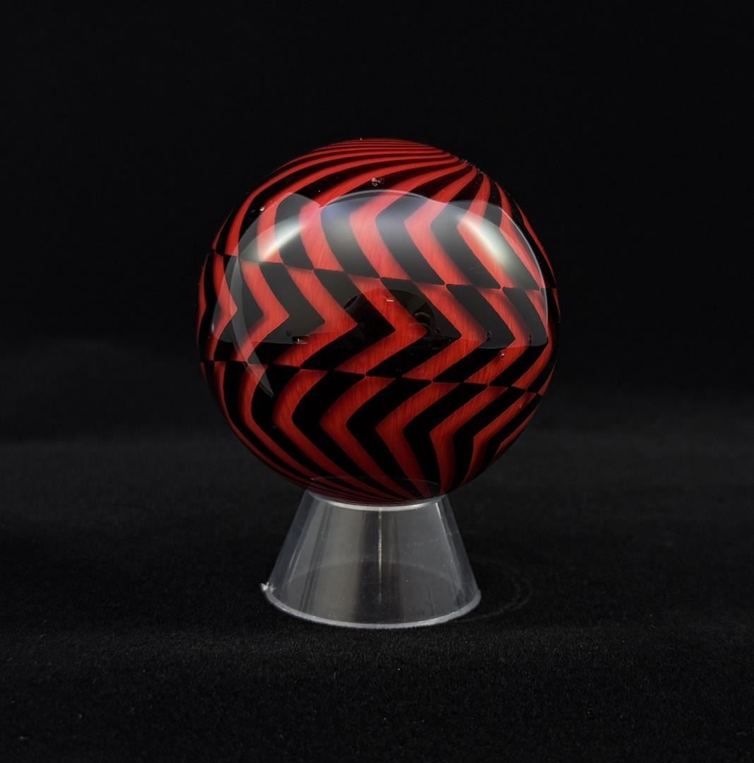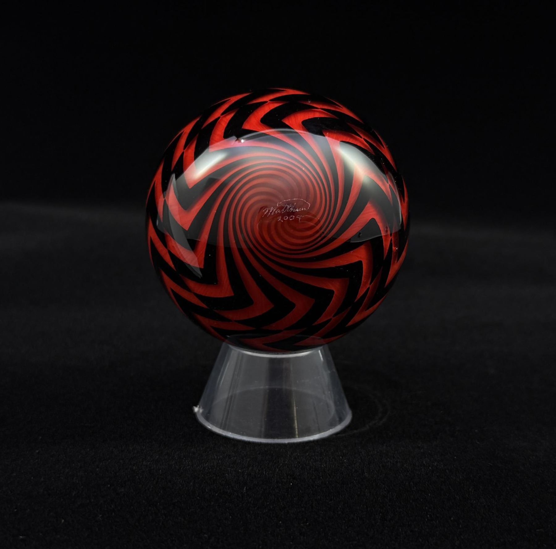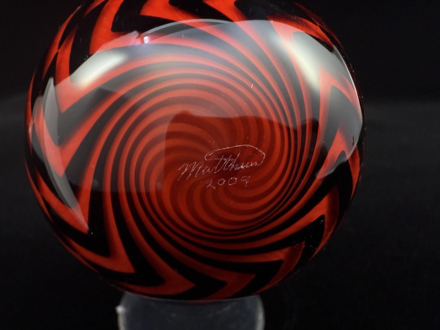 2 1/2" diameter. Signed and dated Matthews 2009. Hazard Pattern. A few small bruises as shown. Mark Matthews is notably recognized for his work in glass, especially in glass spheres. Working with only one assistant, each piece is meticulously worked and signed by the artist. Highly collected and valued, Matthews work has been published in many books and is held in museums such as the Victoria & Albert Museum in London, England, the Corning Museum of Glass in New York, the Toledo Museum of Art in Ohio and the National Museum of American Art, Smithsonian Institution, Washington, D.C.