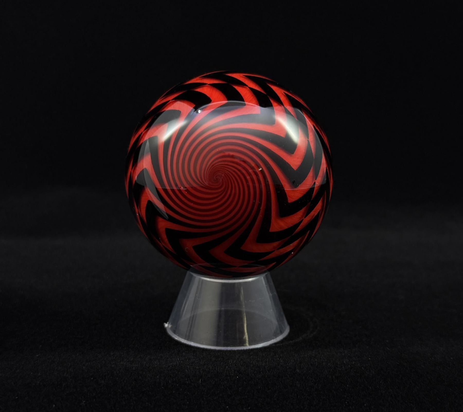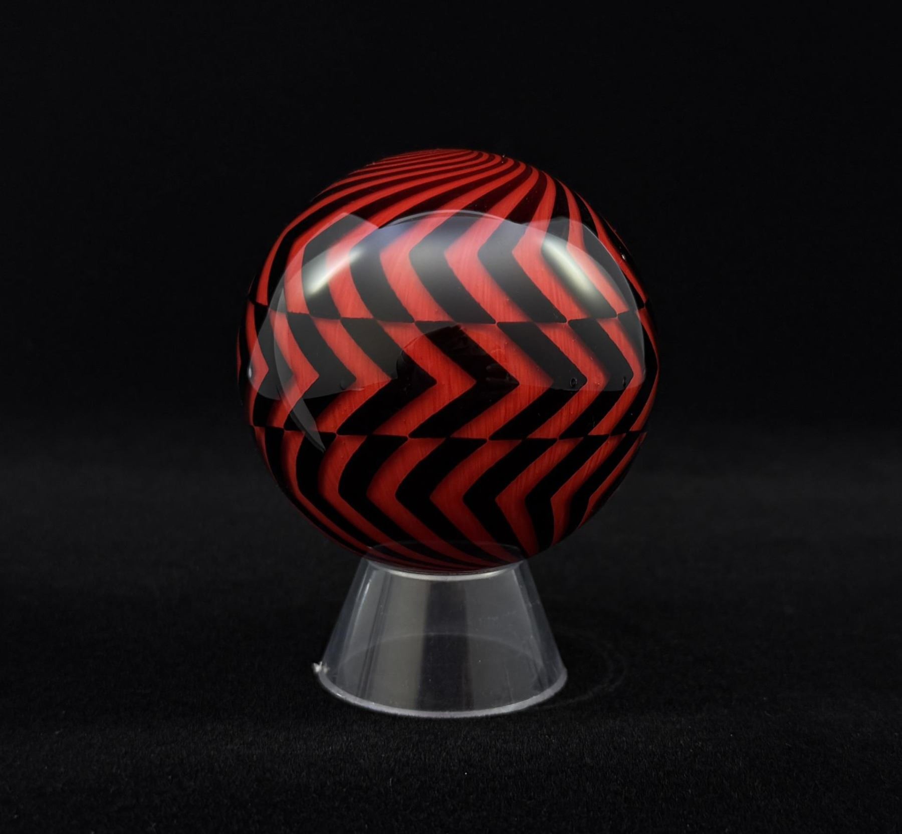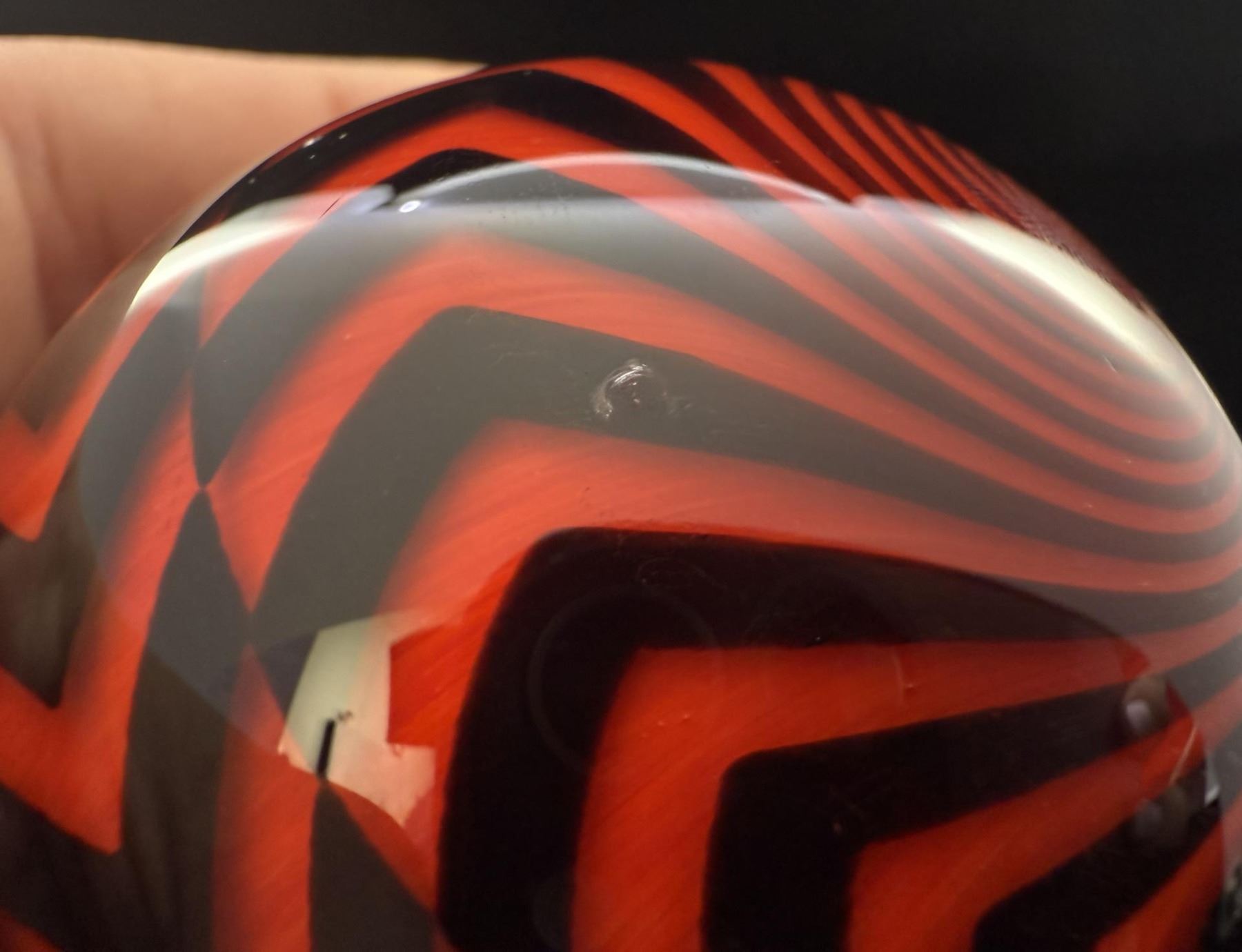 2 1/2" diameter. Signed and dated Matthews 2009. Hazard Pattern. A few small bruises as shown. Mark Matthews is notably recognized for his work in glass, especially in glass spheres. Working with only one assistant, each piece is meticulously worked and signed by the artist. Highly collected and valued, Matthews work has been published in many books and is held in museums such as the Victoria & Albert Museum in London, England, the Corning Museum of Glass in New York, the Toledo Museum of Art in Ohio and the National Museum of American Art, Smithsonian Institution, Washington, D.C.