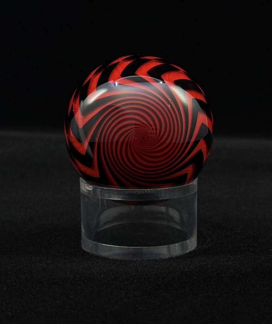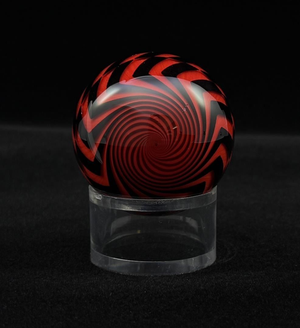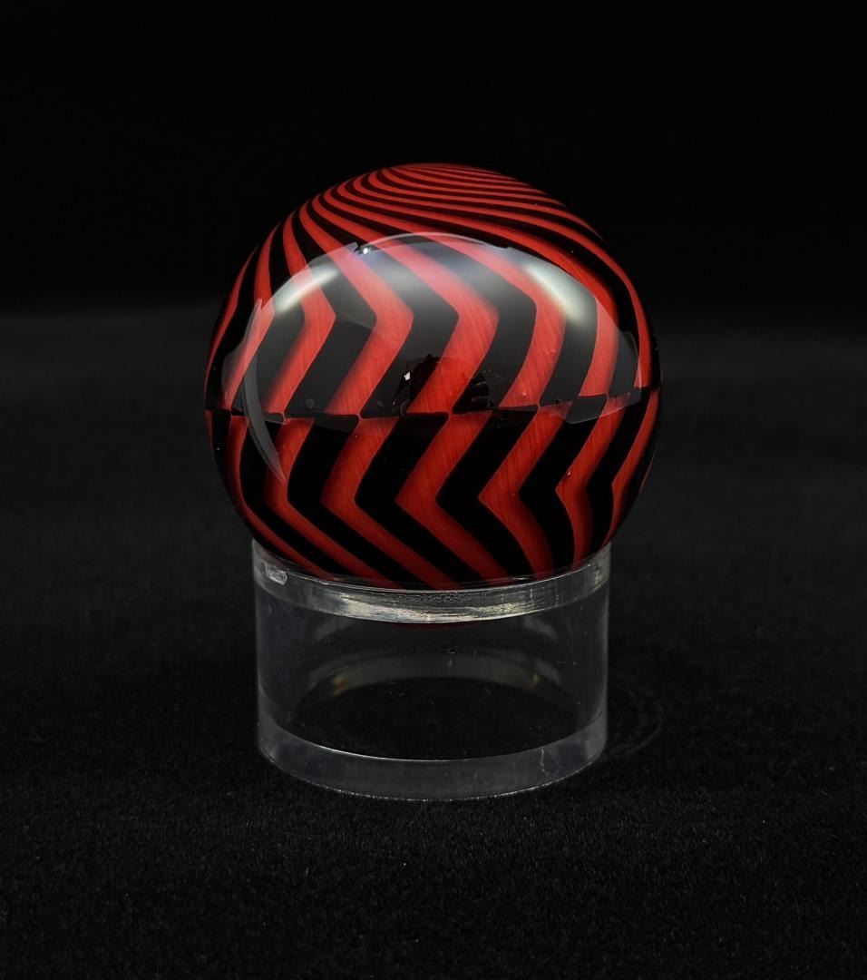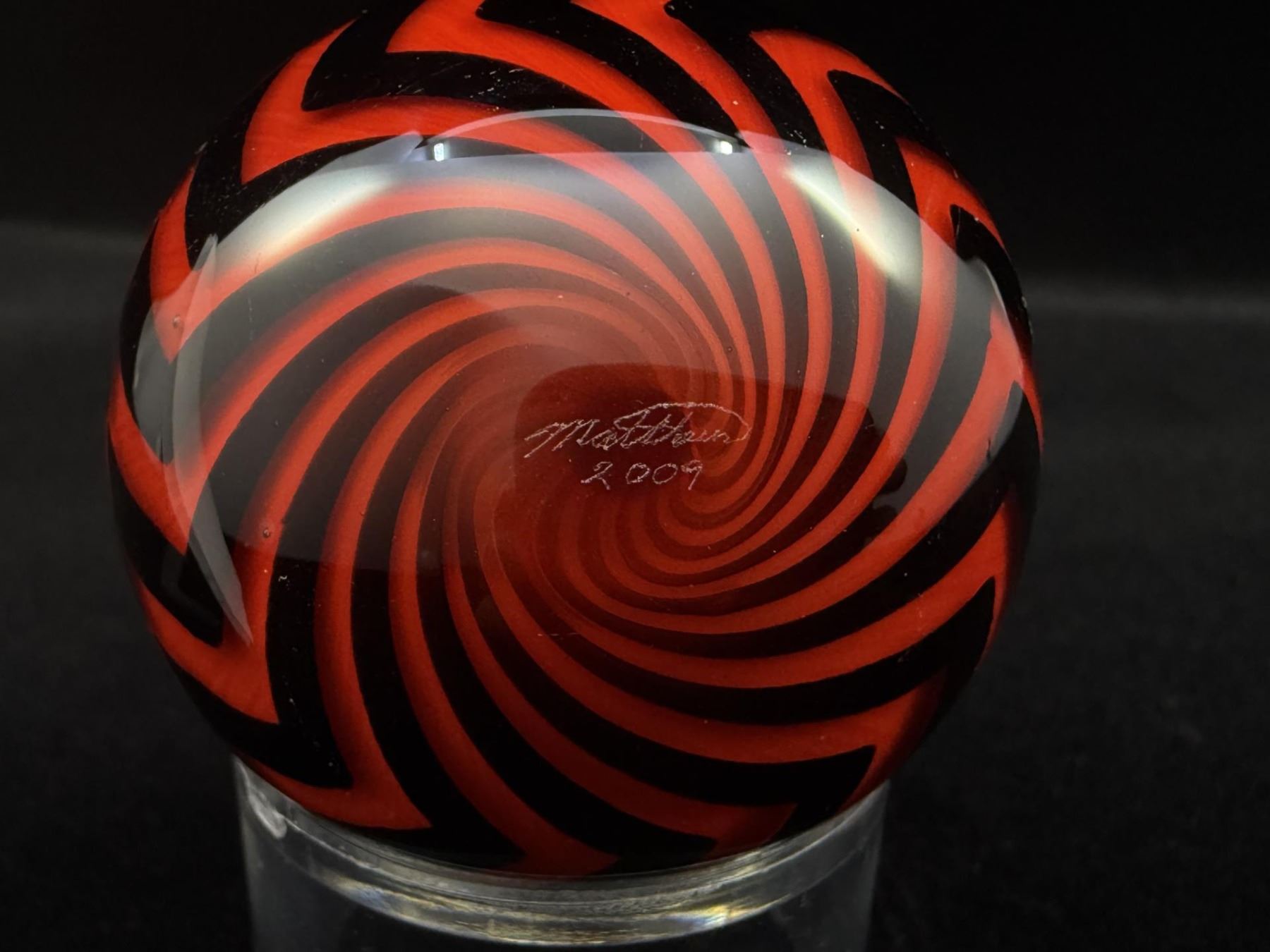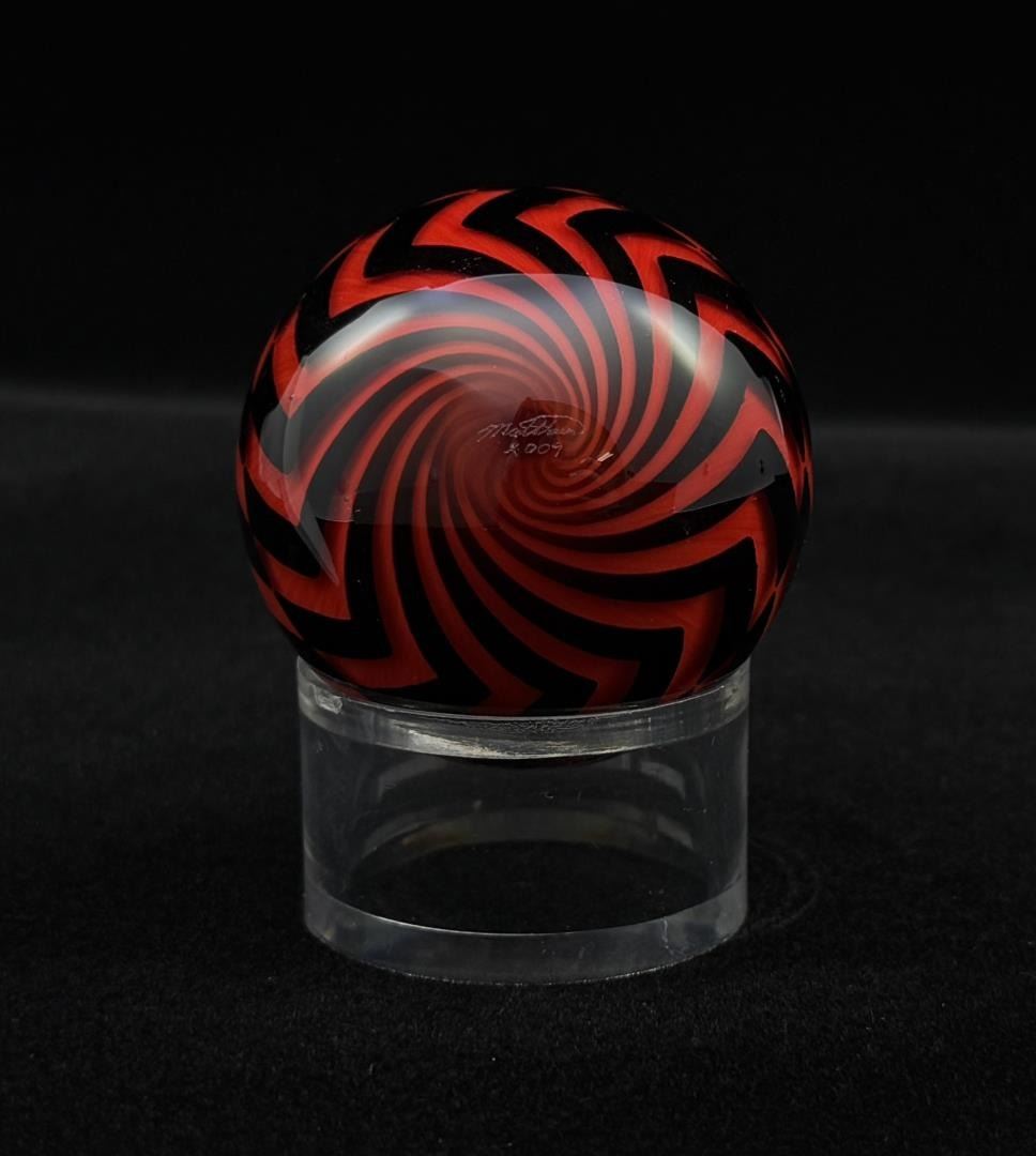 2" diameter. Signed and dated Matthews 2009. Hazard Pattern. A few small bruises as shown. Mark Matthews is notably recognized for his work in glass, especially in glass spheres. Working with only one assistant, each piece is meticulously worked and signed by the artist. Highly collected and valued, Matthews work has been published in many books and is held in museums such as the Victoria & Albert Museum in London, England, the Corning Museum of Glass in New York, the Toledo Museum of Art in Ohio and the National Museum of American Art, Smithsonian Institution, Washington, D.C.