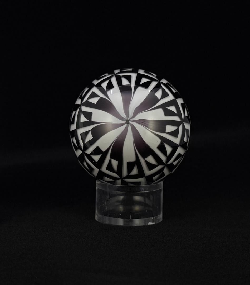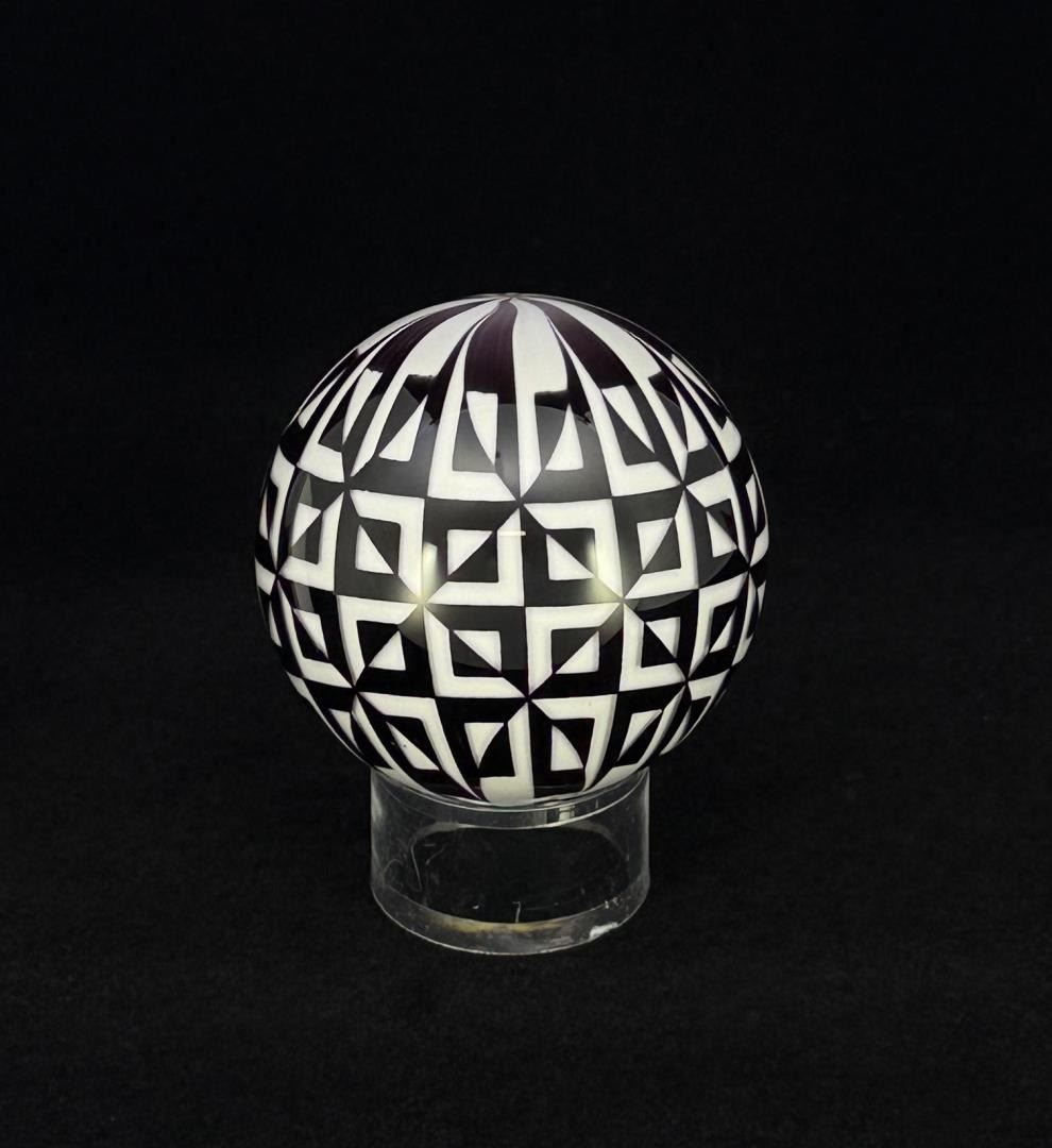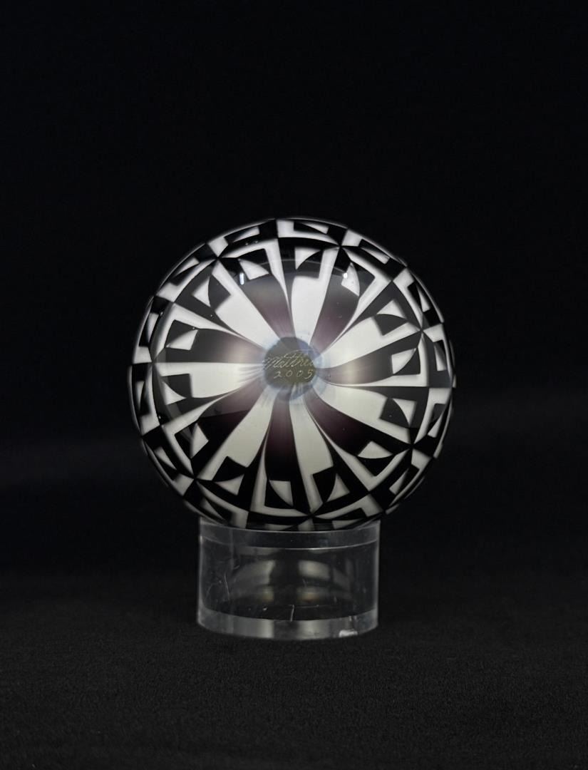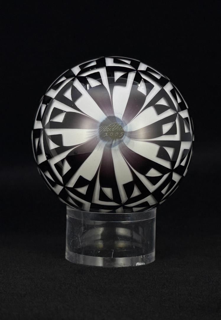 2 7/8" diameter. Signed and dated Matthews 2005. Black and White Graal Sphere. A few small bruises as shown. Mark Matthews is notably recognized for his work in glass, especially in glass spheres. Working with only one assistant, each piece is meticulously worked and signed by the artist. Highly collected and valued, Matthews work has been published in many books and is held in museums such as the Victoria & Albert Museum in London, England, the Corning Museum of Glass in New York, the Toledo Museum of Art in Ohio and the National Museum of American Art, Smithsonian Institution, Washington, D.C.