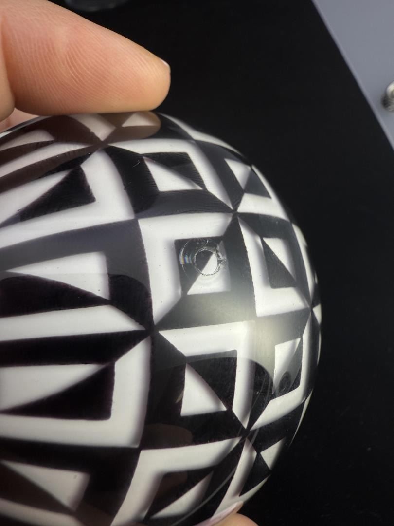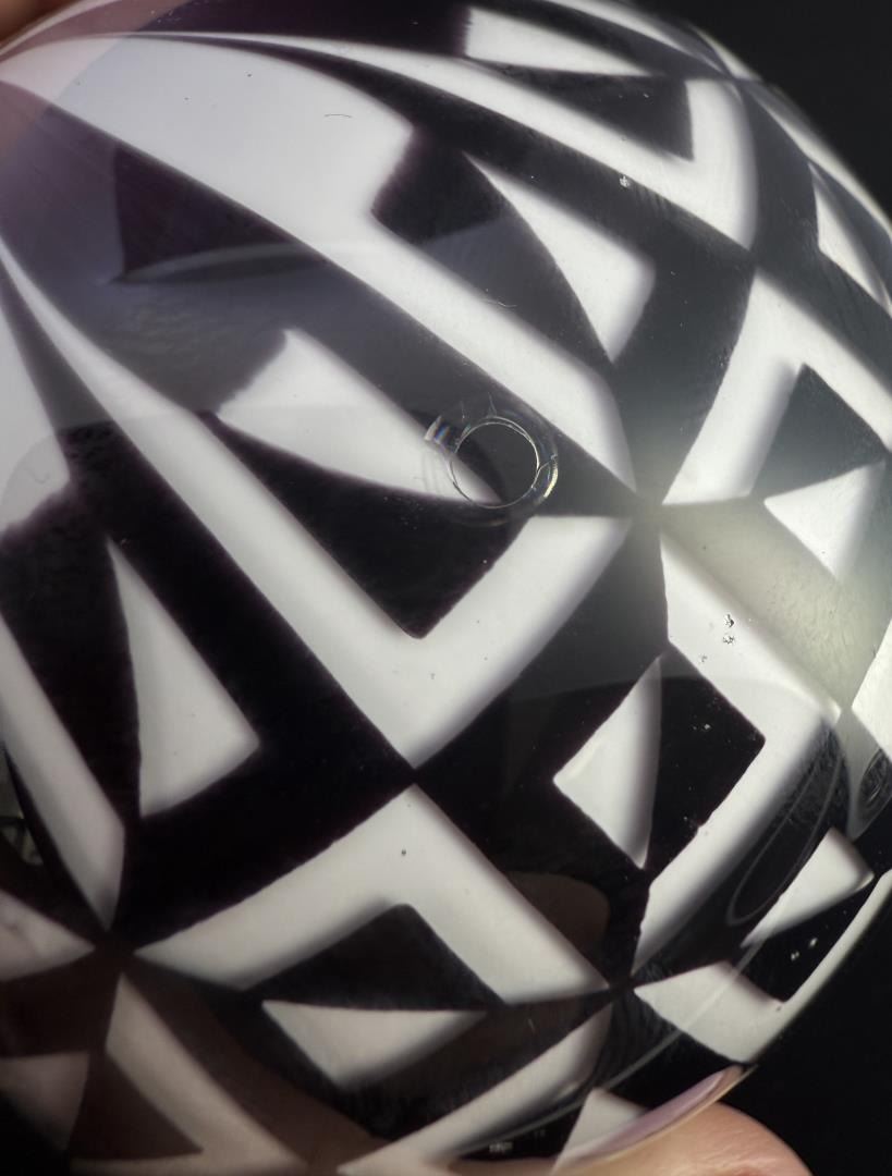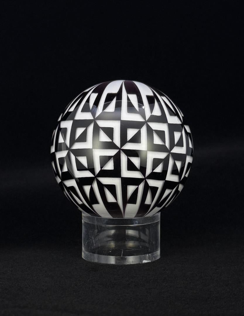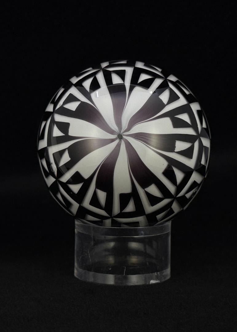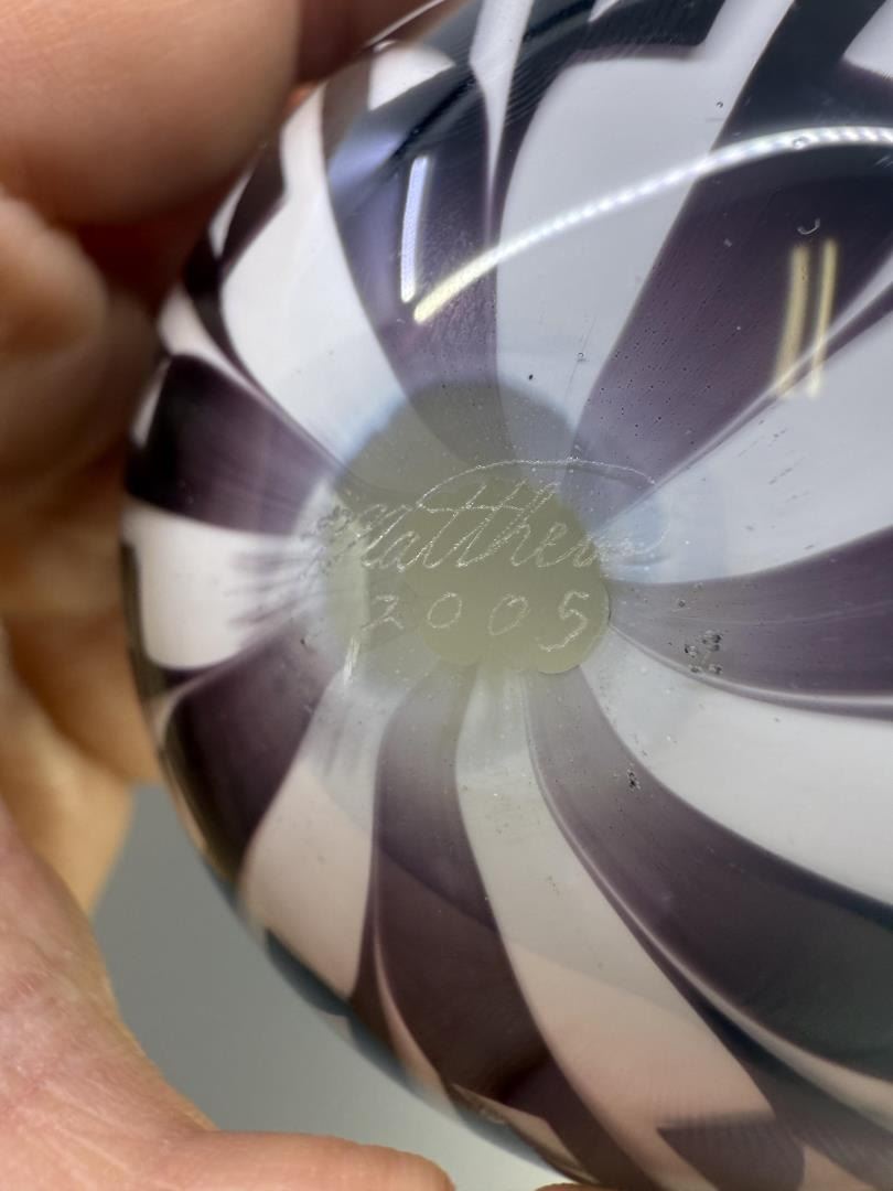 2 7/8" diameter. Signed and dated Matthews 2005. Black and White Graal Sphere. A few small bruises as shown. Mark Matthews is notably recognized for his work in glass, especially in glass spheres. Working with only one assistant, each piece is meticulously worked and signed by the artist. Highly collected and valued, Matthews work has been published in many books and is held in museums such as the Victoria & Albert Museum in London, England, the Corning Museum of Glass in New York, the Toledo Museum of Art in Ohio and the National Museum of American Art, Smithsonian Institution, Washington, D.C.