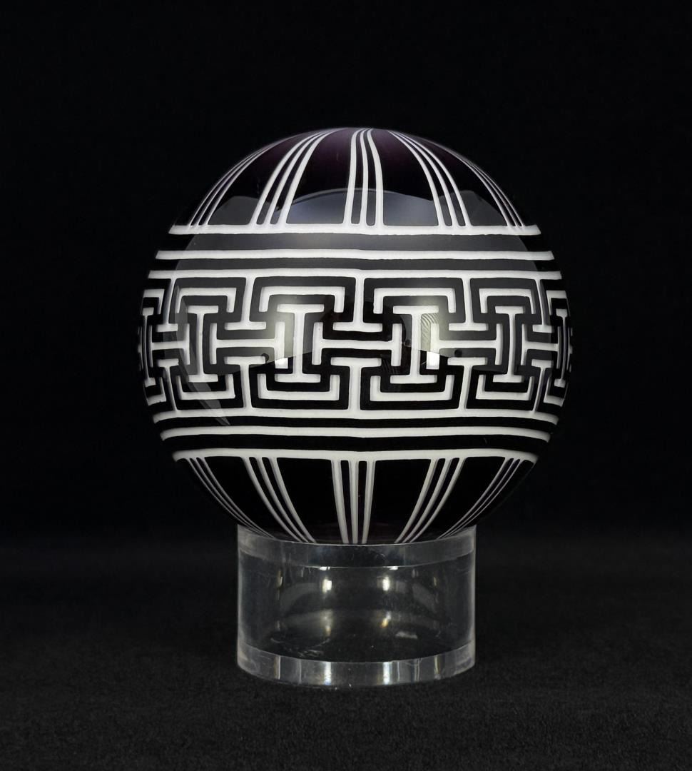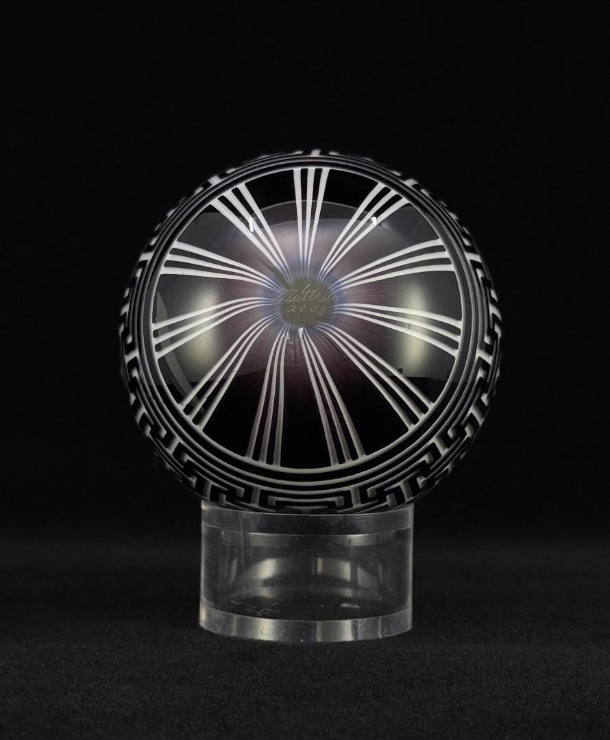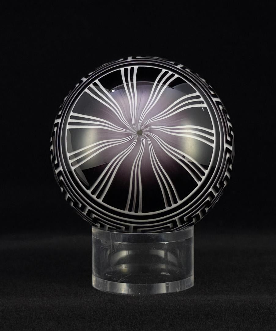 2 15/16" diameter. Signed and dated Matthews 2005. Black and White Graal Sphere. A few small bruises as shown. Mark Matthews is notably recognized for his work in glass, especially in glass spheres. Working with only one assistant, each piece is meticulously worked and signed by the artist. Highly collected and valued, Matthews work has been published in many books and is held in museums such as the Victoria & Albert Museum in London, England, the Corning Museum of Glass in New York, the Toledo Museum of Art in Ohio and the National Museum of American Art, Smithsonian Institution, Washington, D.C.