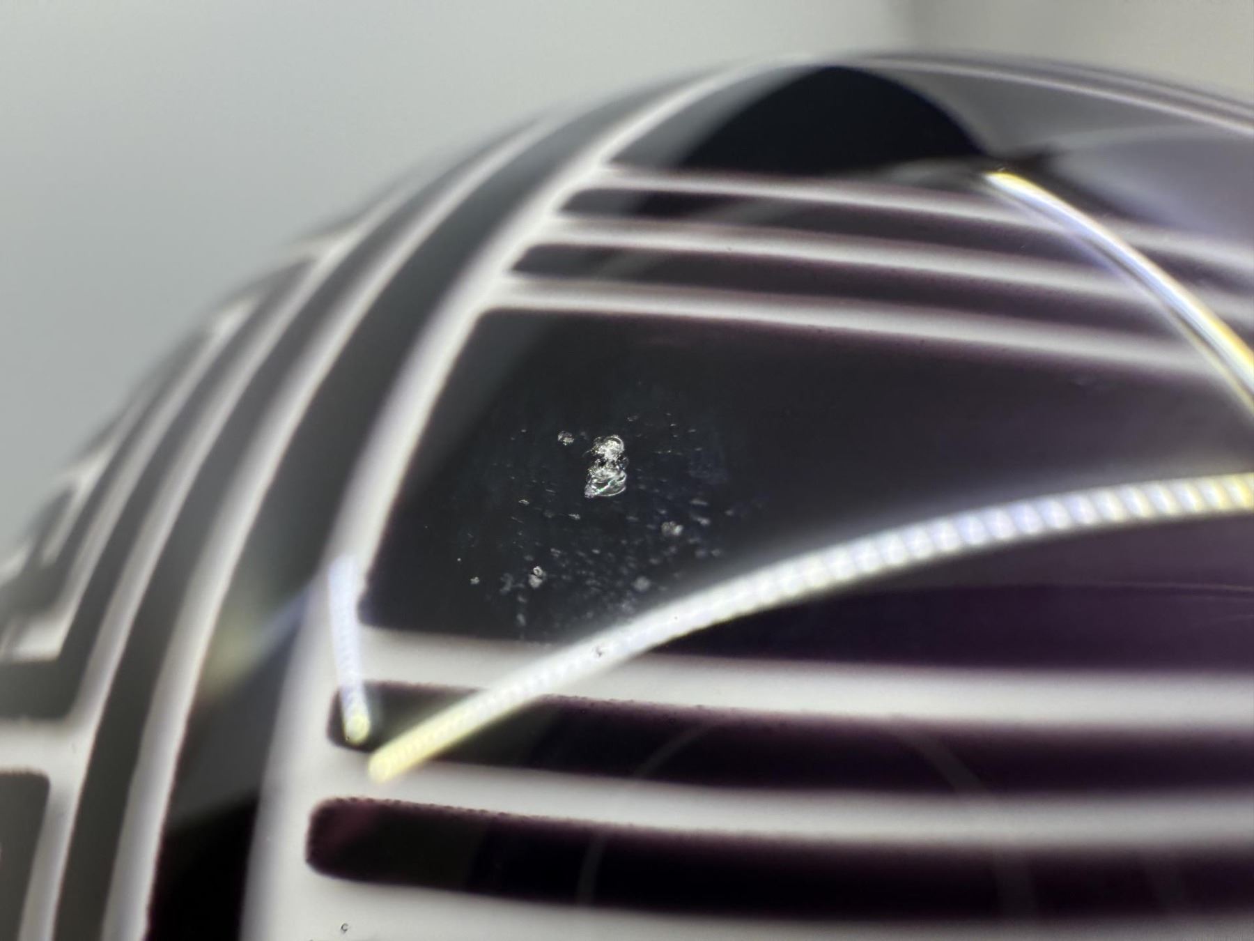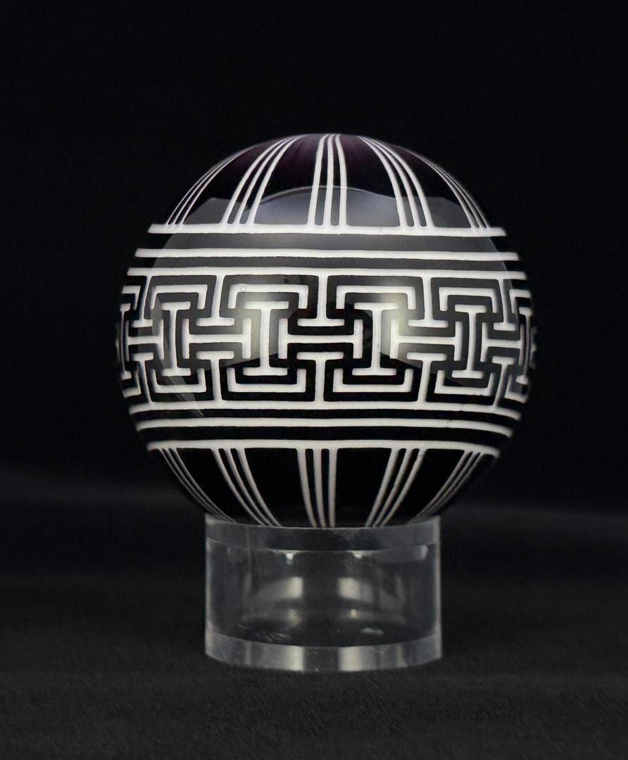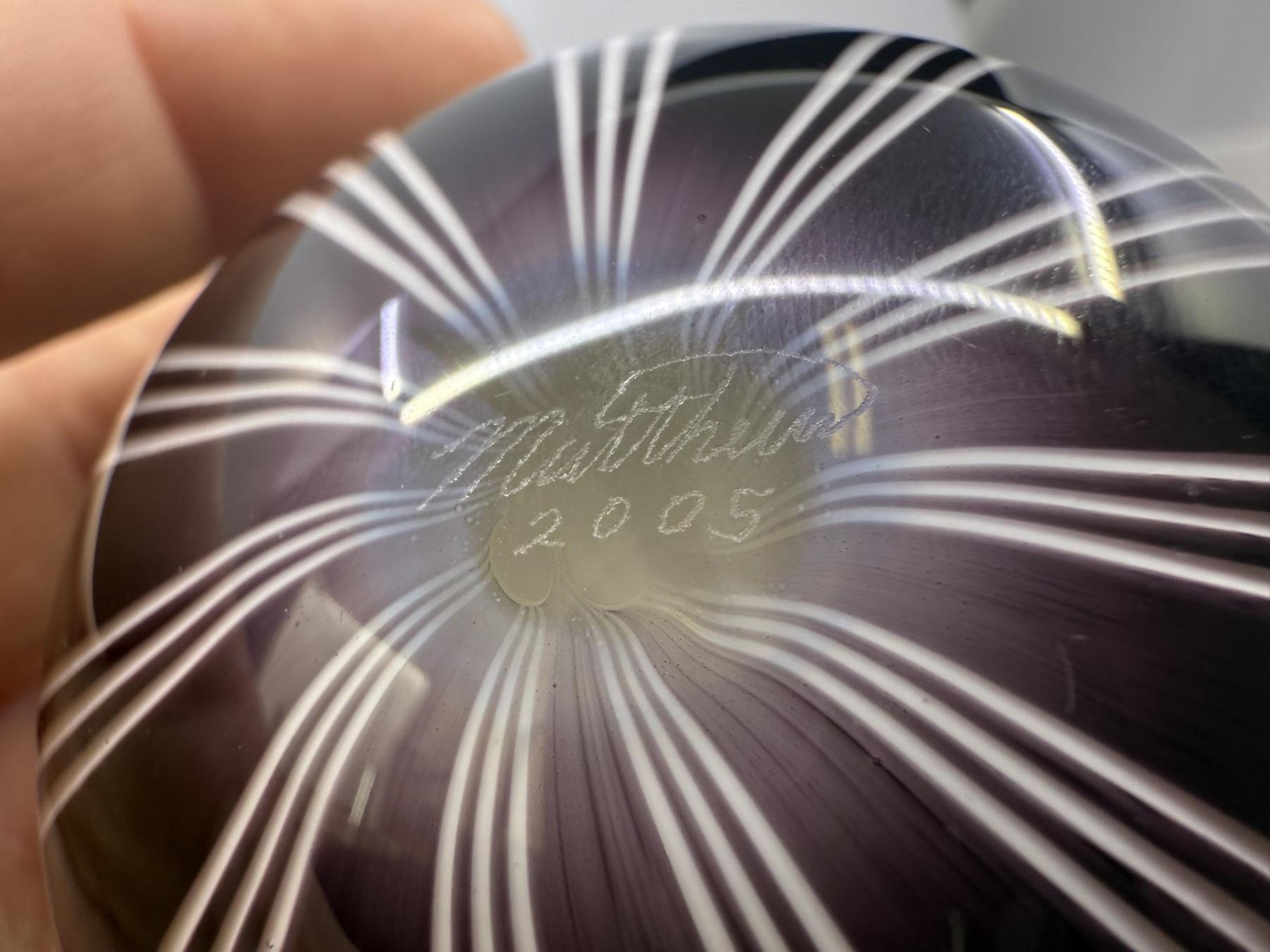 2 15/16" diameter. Signed and dated Matthews 2005. Black and White Graal Sphere. A few small bruises as shown. Mark Matthews is notably recognized for his work in glass, especially in glass spheres. Working with only one assistant, each piece is meticulously worked and signed by the artist. Highly collected and valued, Matthews work has been published in many books and is held in museums such as the Victoria & Albert Museum in London, England, the Corning Museum of Glass in New York, the Toledo Museum of Art in Ohio and the National Museum of American Art, Smithsonian Institution, Washington, D.C.