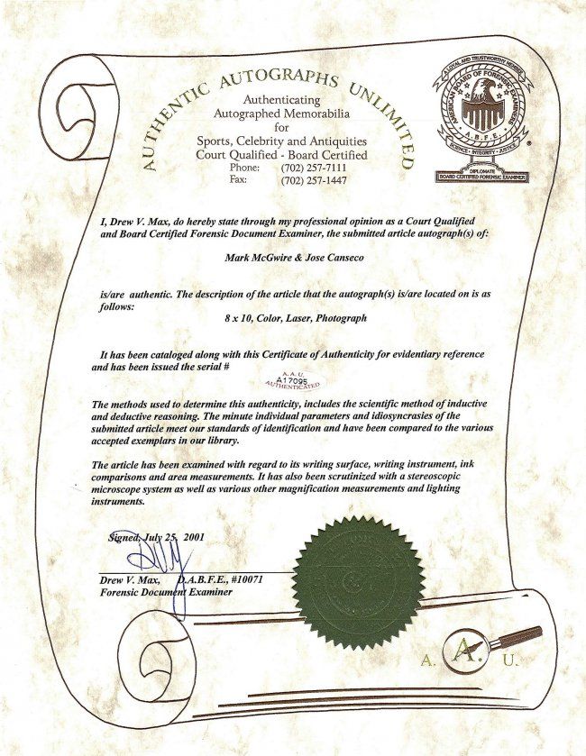 Mark McGwire and Jose Canseco Signed Photograph Certified by AAU