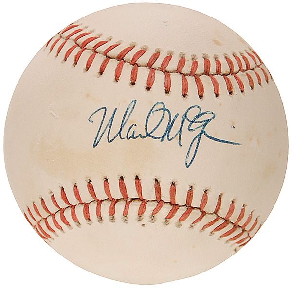 Two baseballs: an official Rawlings 1987 All Star Game baseball signed by McGwire in blue ballpoint on the sweet spot; and an official Rawlings American League baseball signed by Clemens in blue ballpoint on the sweet spot, adding “CY 5.” In fine condition, with scattered toning to the McGwire baseball. The McGwire baseball features an uncommon early signature of the one-time single season home run king.