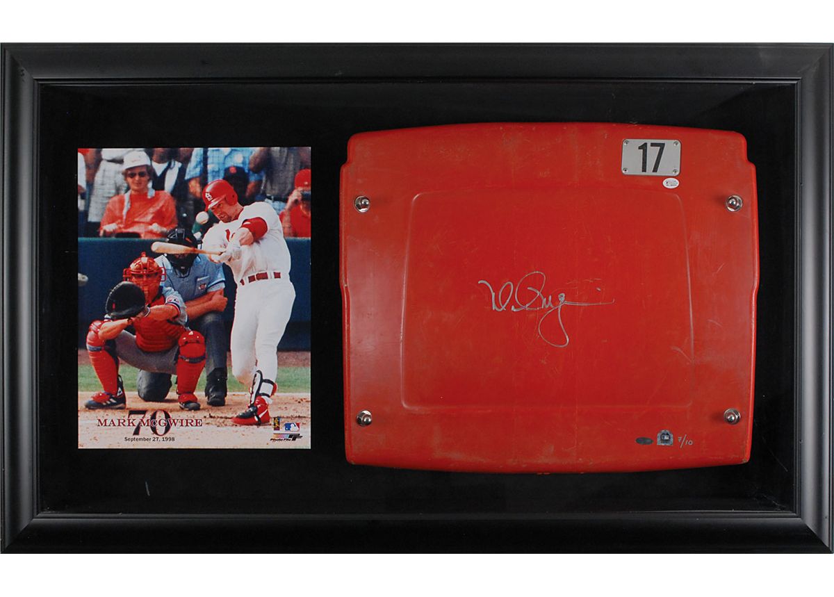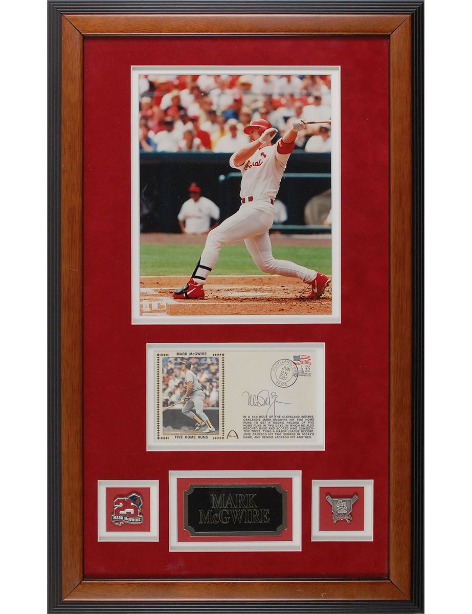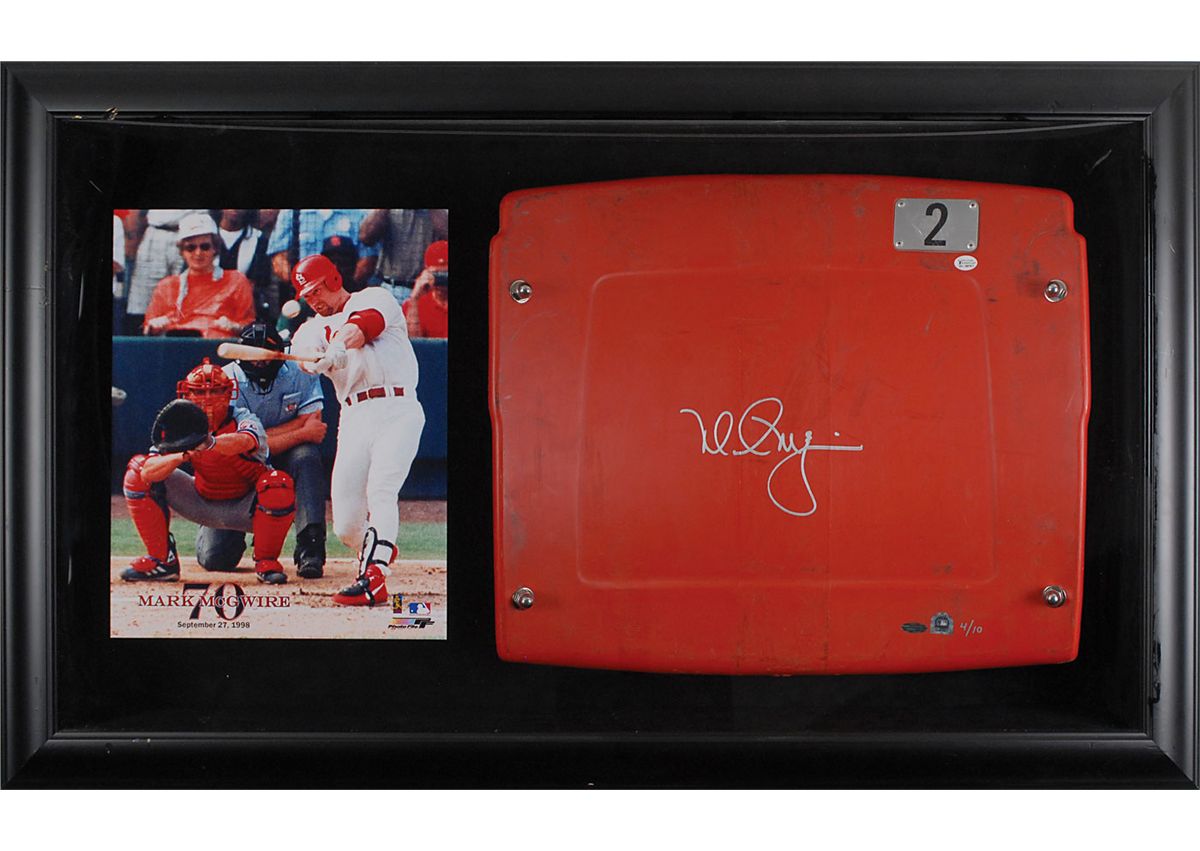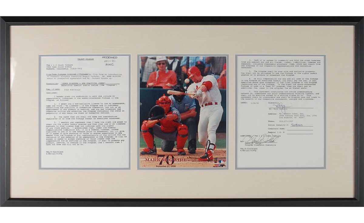 Four items: two limited edition original red seat backs removed from Busch Stadium in St. Louis, numbered 4/10 and 7/10, both prominently signed in silver ink. Seats are mounted inside shadowboxes with images of McGwire’s 70th home run in 1998 to overall sizes of 38 x 24; DS, two pages, 7.5 x 9.5, May 30, 1991. Talent release allowing the use of a clip in which “Mr. Mark McGwire makes an unexpected appearance” on a program called “Super Bloopers & New Practical Jokes.” Nicely double-cloth-matted and framed with an image of his 70th home run to an overall size of 32 x 17; and a commemorative cover with a cachet honoring McGwire’s record of five home runs in two days, signed in black ballpoint. Gorgeously double-matted and framed with a photo, nameplate, and two pins to an overall size of 14.5 x 23.5. In overall fine condition. Seat backs are accompanied by certificates of authenticity from Steiner Sports. Oversized.