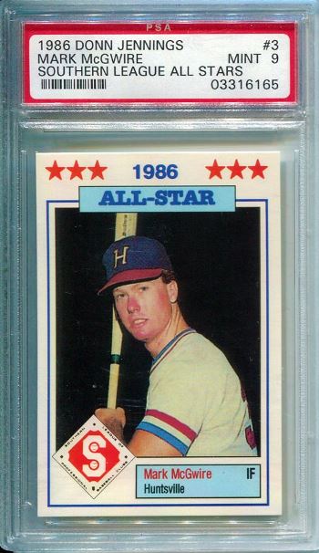 Mark McGwire is one of the greatest home run hitters of his era. His talents didn’t take long to surface either. During his first season in 1987, “Big Mac” led the league in HR with 49 and was named Rookie of the Year. Splitting time between Oakland and St. Louis throughout his 16-year career, McGwire and former Chicago Cubs rival, Sammy Sosa, captivated the nation during their HR chase in 1998. That season, McGwire hit an unprecedented 70 HR, blowing away the previous record of 61 held by Roger Maris. McGwire finished his career with 583 HR, was named to the All-Star team 12 times, and won a World Series Title in Oakland in 1989. This is a Mark McGwire 1986 Donn Jennings Southern League All-Star Card Graded PSA Mint 9