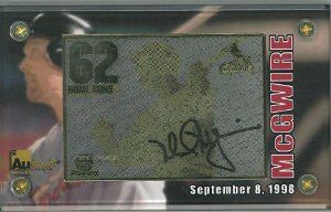 Mark McGwire is one of the greatest home run hitters of his era. His talents didn’t take long to surface either. During his first season in 1987, “Big Mac” led the league in HR with 49 and was named Rookie of the Year. Splitting time between Oakland and St. Louis throughout his 16-year career, McGwire and former Chicago Cubs rival, Sammy Sosa, captivated the nation during their HR chase in 1998. That season, McGwire hit an unprecedented 70 HR, blowing away the previous record of 61 held by Roger Maris. McGwire finished his career with 583 HR, was named to the All-Star team 12 times, and won a World Series Title in Oakland in 1989. This is a Mark McGwire unsigned St. Louis Cardinals 24 Karat Gold Signature Card. Limited Edition of 6300. Slabbed to overall size of 3.5" x 5.5". Error Card as is, no returns.