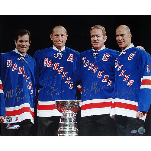 Mark Messier / Brian Leetch / Adam Graves / Mike Richter Multi Signed with Cup Horizontal 16x20 Photo w/ "Years Insc."