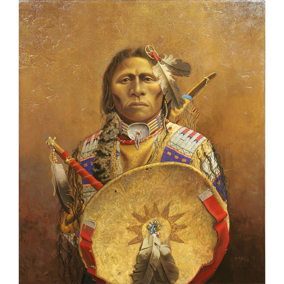 Mark Rohrig (1955 - ). Yellow Moon. 50" x 60" oil on canvas. Signed lower right: Mark Rohrig ©. A well known surrealist inspired by the mystical nobility of the Native American people.