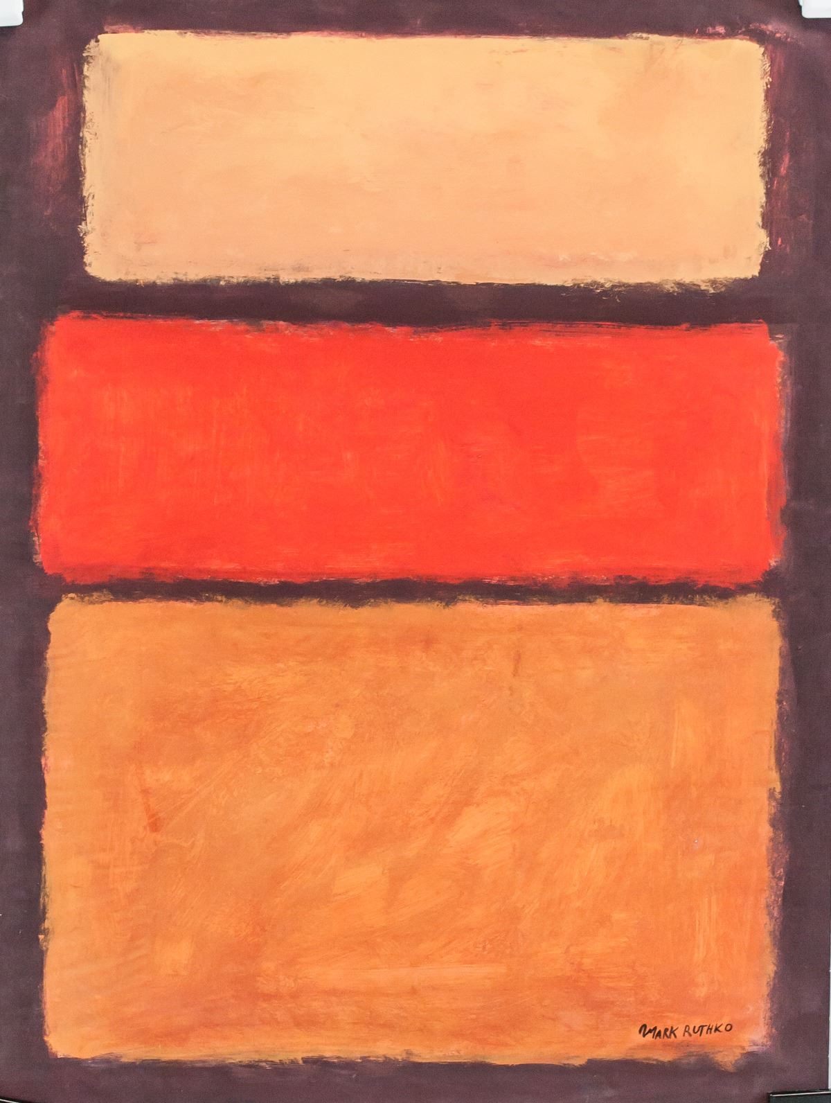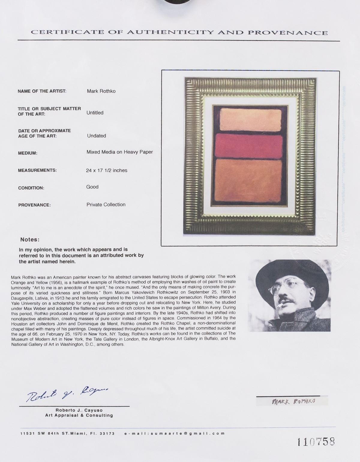 Gouache on paper. Featuring abstract composition of three blocks of color. Signed "MARK ROTHKO" to the bottom right corner. Accompanied by Certificate of Authentication. Attributed to Mark Rothko (1903-1970, American). 61 x 45 cm (24 x 17.75 in). Provenance: This lot carries limited provenance from a British estate