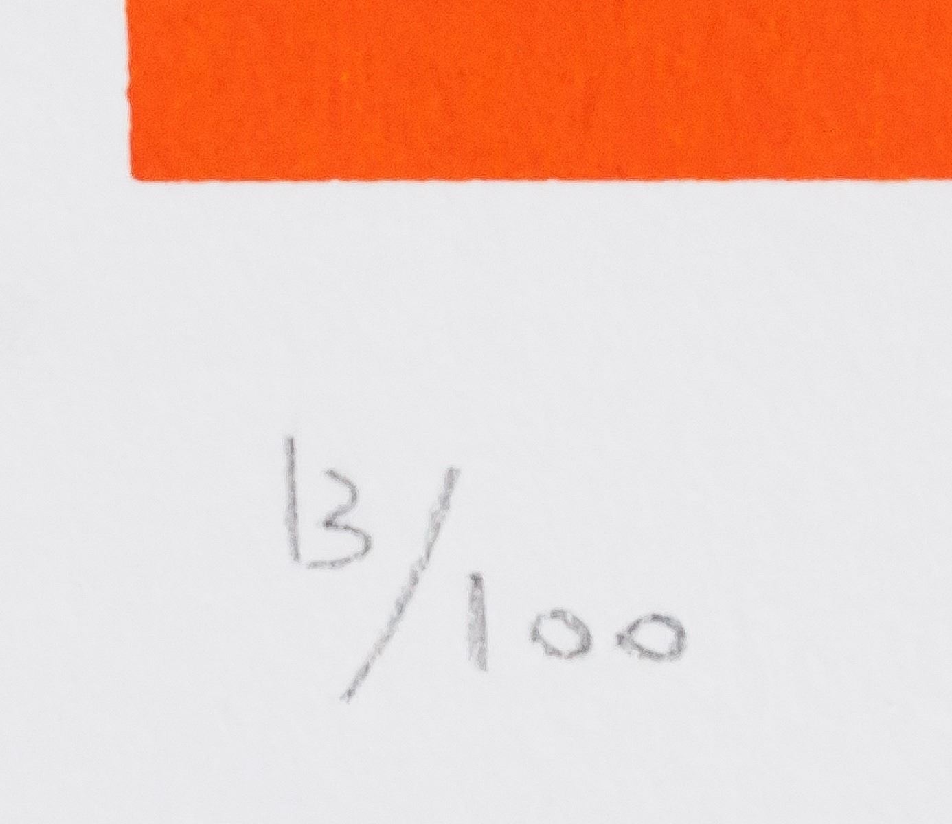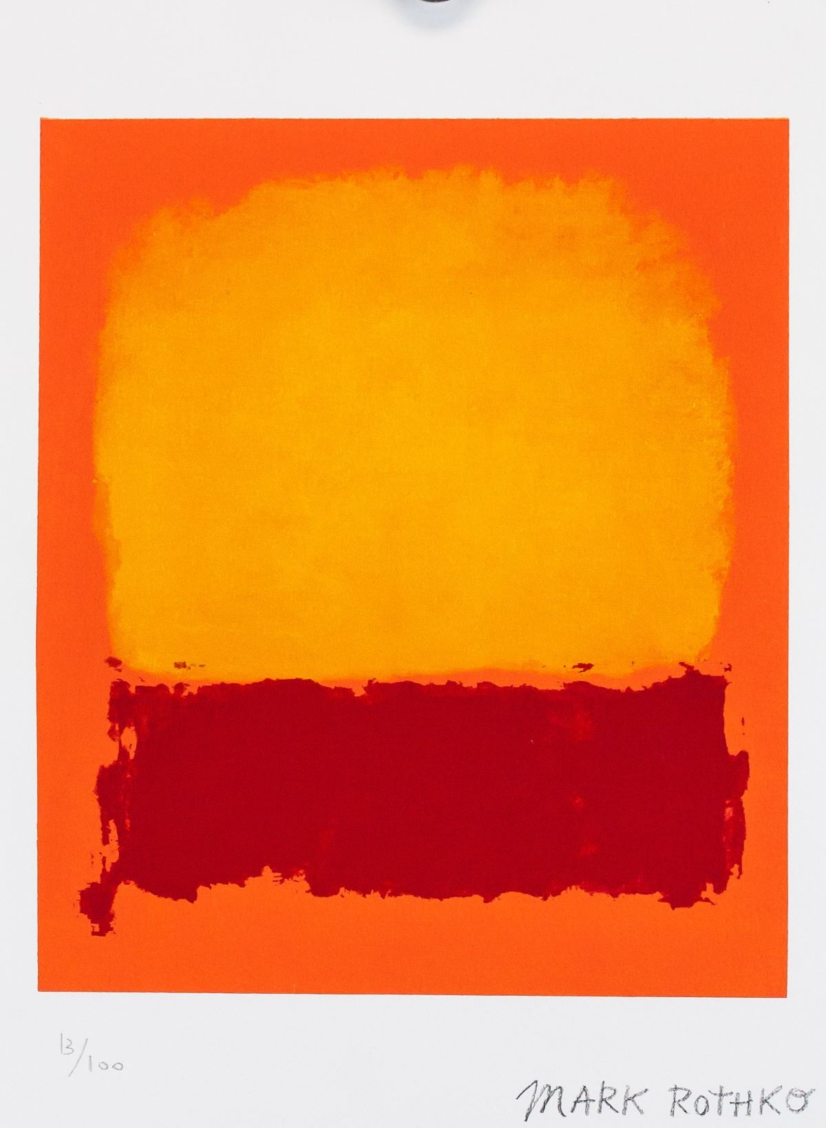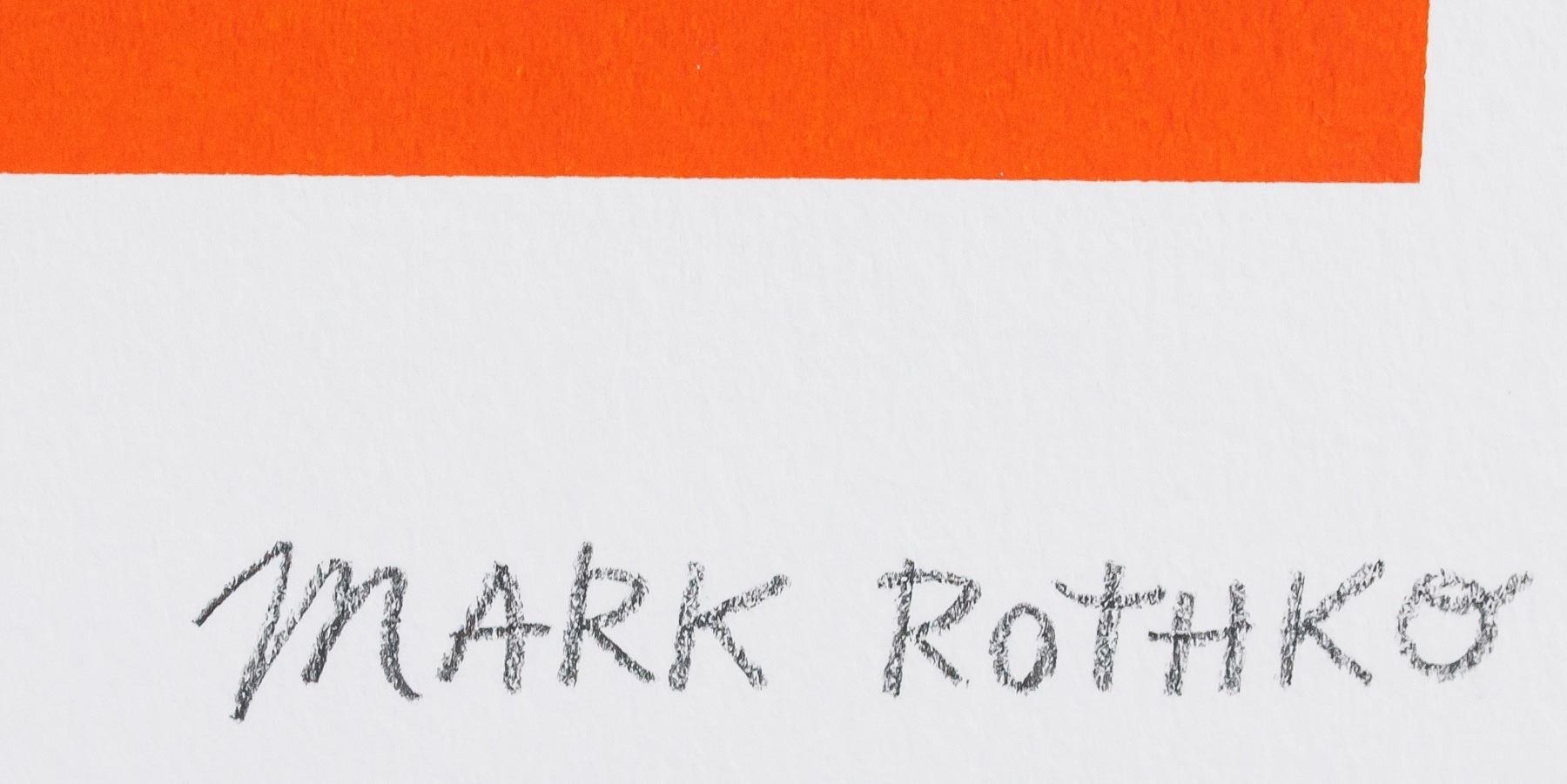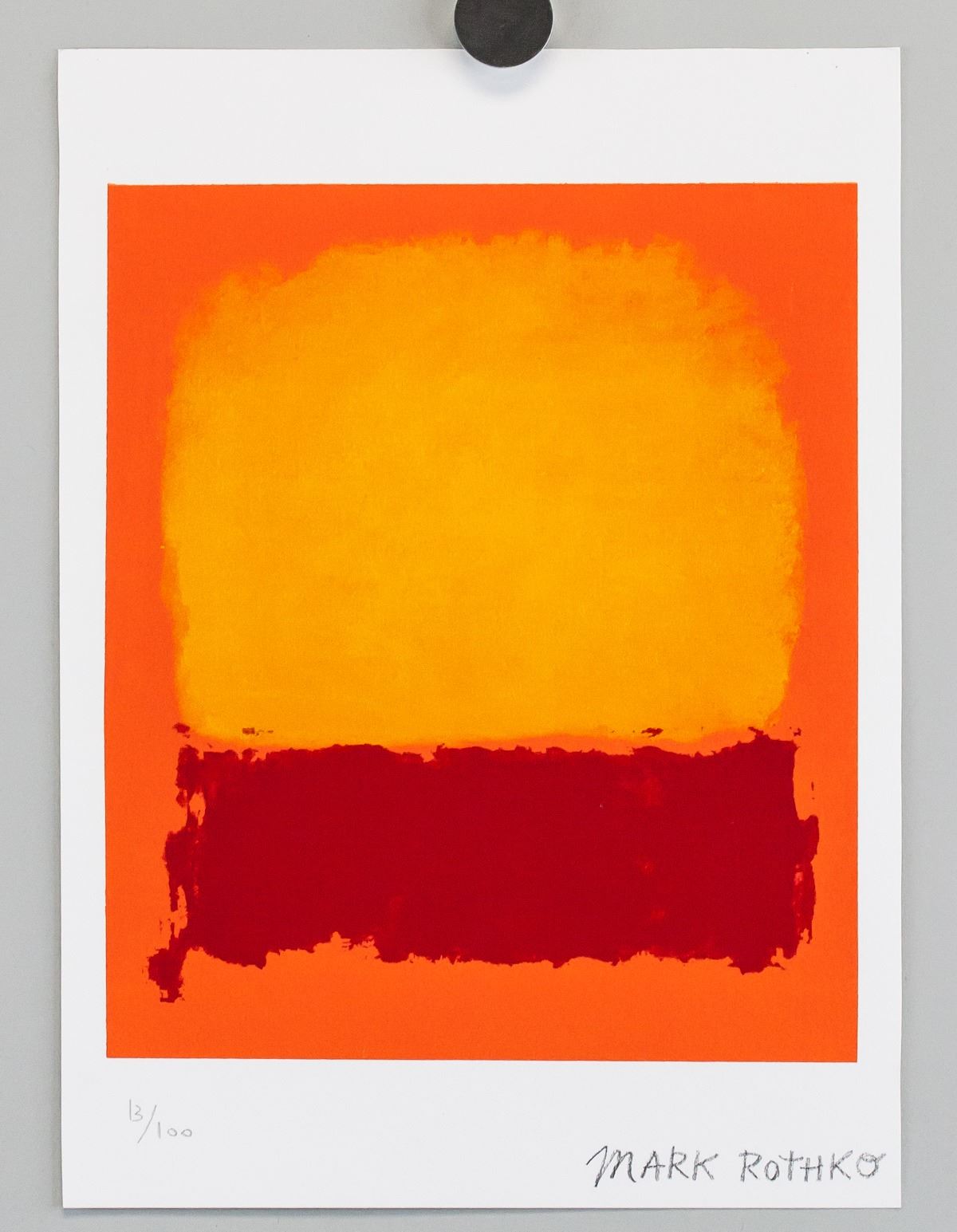 Silkscreen on paper. Featuring abstract composition of orange, yellow, and red. Signed "MARK ROTHKO" in the bottom right corner. "13/100" inscribed in the bottom left corner. "V" inscribed on verso. "JCA" stamped on verso. Attributed to Mark Rothko (1903-1970, American). 29 x 21 cm (11.5 x 8.25). Provenance: This lot carries limited provenance from a Southern Ontario estate.