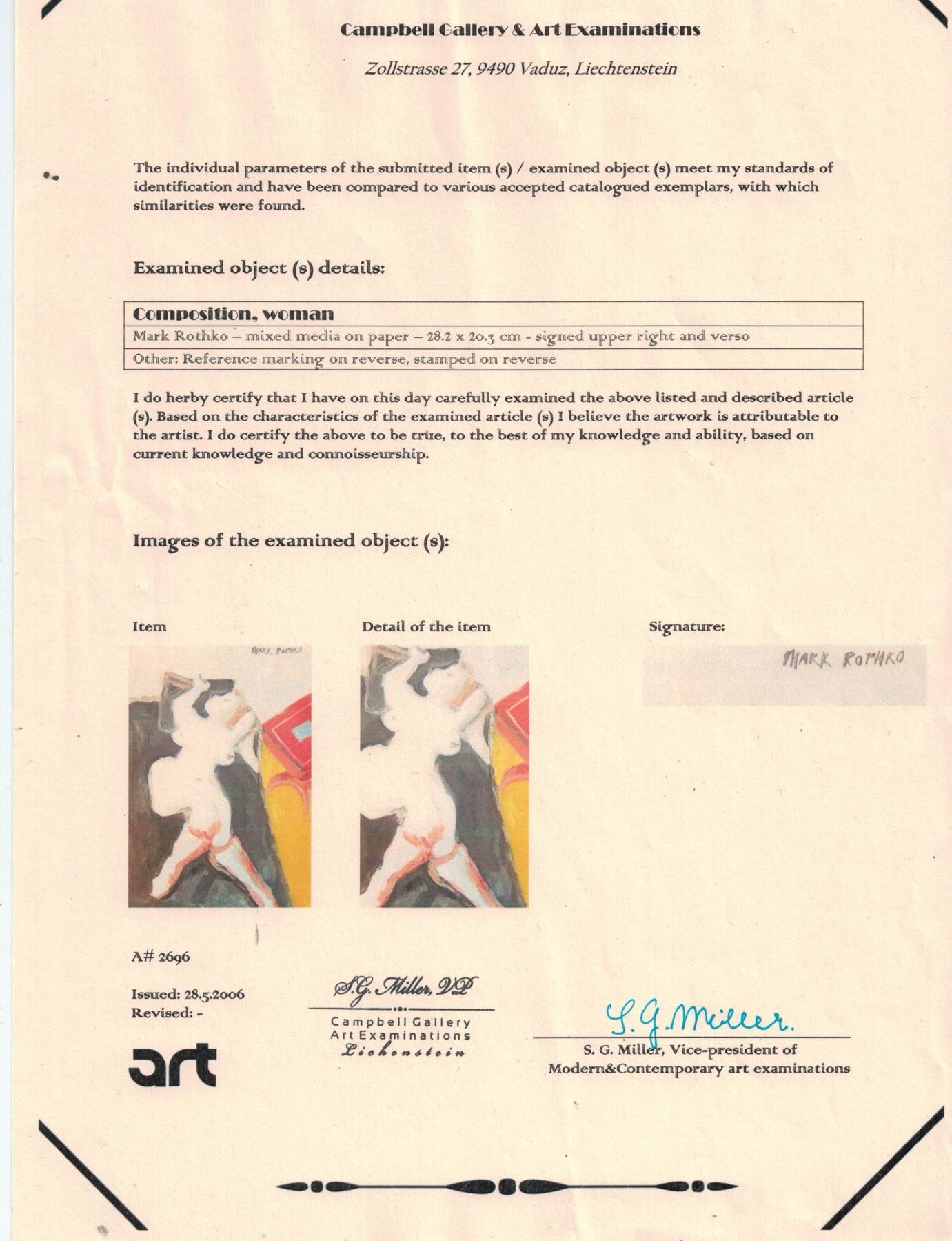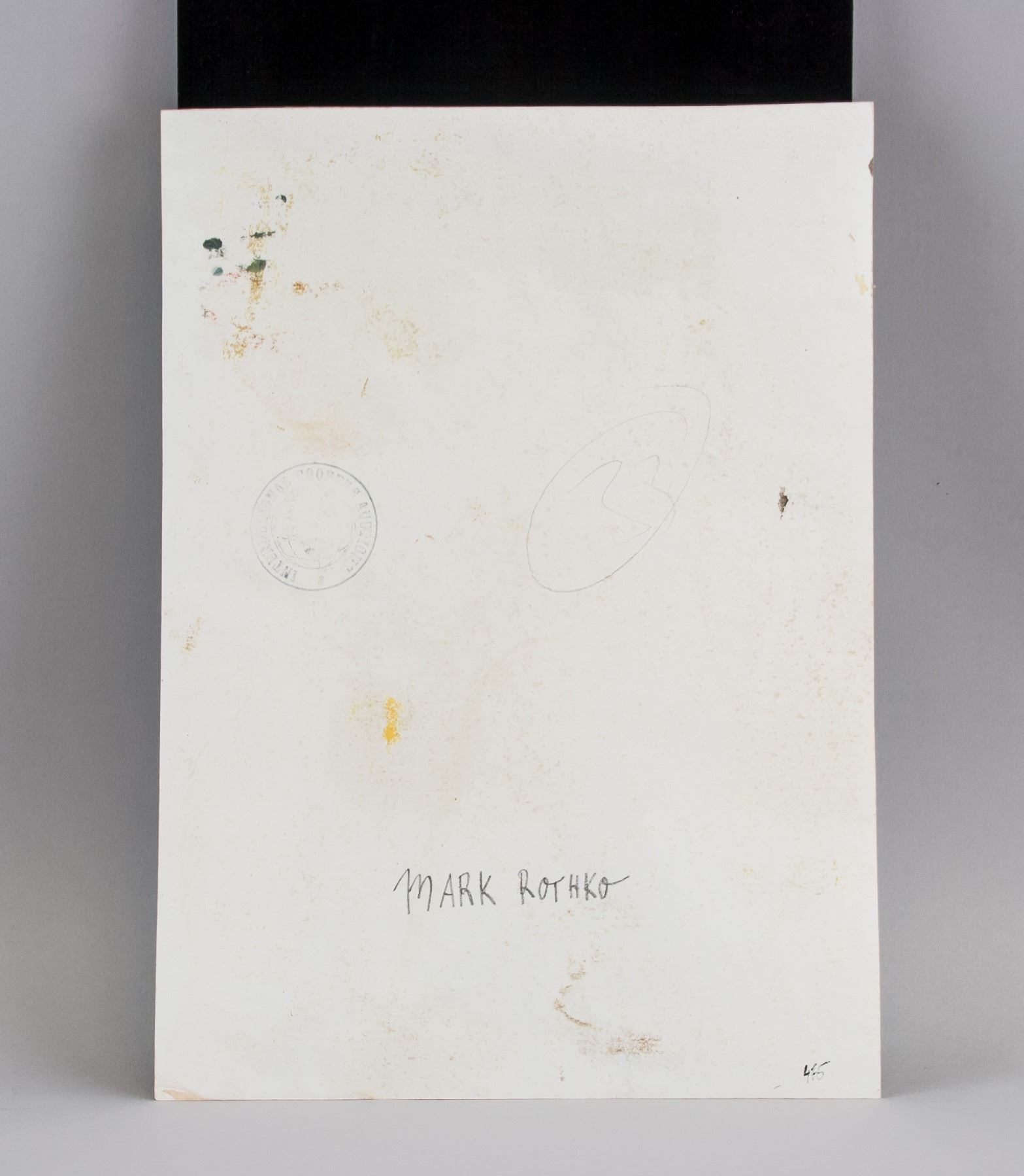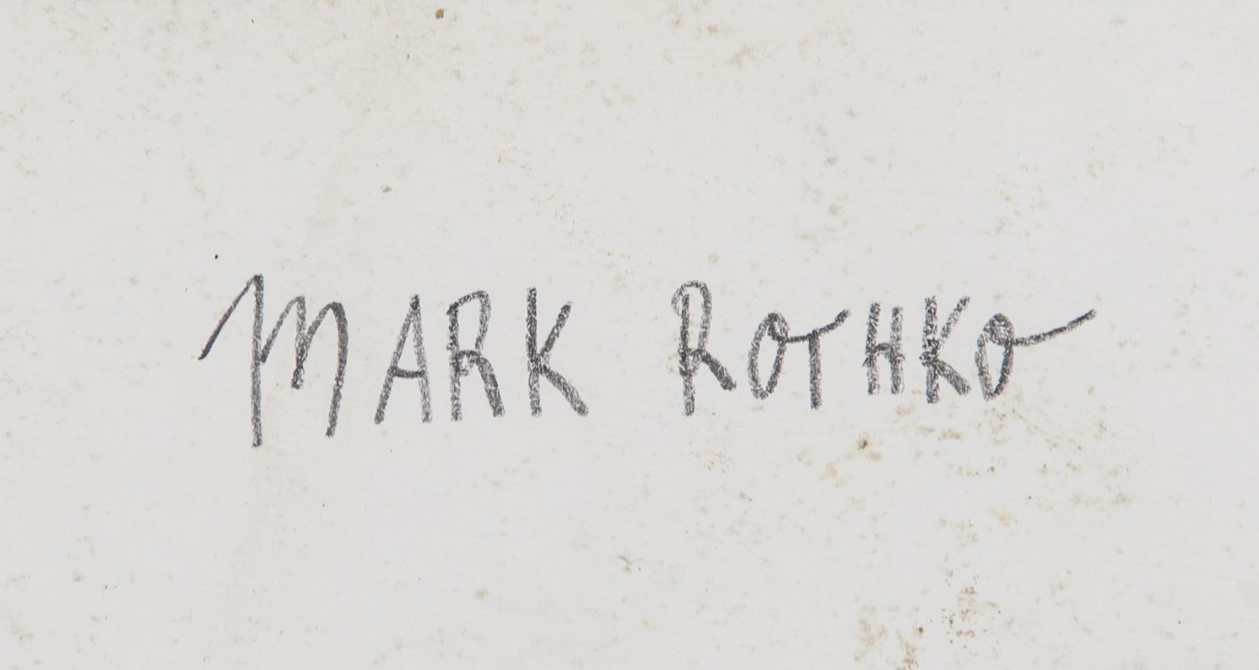 Signed and attr. Mark Rothko (American, 1903-1970) top right corner and stamped, on verso. Accompanied by a certificate of attribution from Campbell Gallery & Art Examinations, Lichtenstein. 11.1 x 8.0 inch (28.2 x 20.3 cm). Mark Rothko’s search to express profound emotion through painting culminated in his now-signature compositions of richly colored squares filling large canvases, evoking what he referred to as “the sublime.” One of the pioneers of Color Field Painting, Rothko’s abstract arrangements of shapes, ranging from the slightly surreal biomorphic ones in his early works to the dark squares and rectangles in later years, are intended to evoke the metaphysical through viewers’ communion with the canvas in a controlled setting. “I'm not an abstractionist,” he once said. “I'm interested only in expressing basic human emotions: tragedy, ecstasy, doom, and so on.” His “Rothko Chapel Paintings” (1964-1967), 14 wall-sized monochromatic black paintings installed in a non-denominational church in Houston, Texas, represent the realization of Rothko’s desire that his work be viewed in close quarters. PROVENANCE: Private (Chicago, IL)