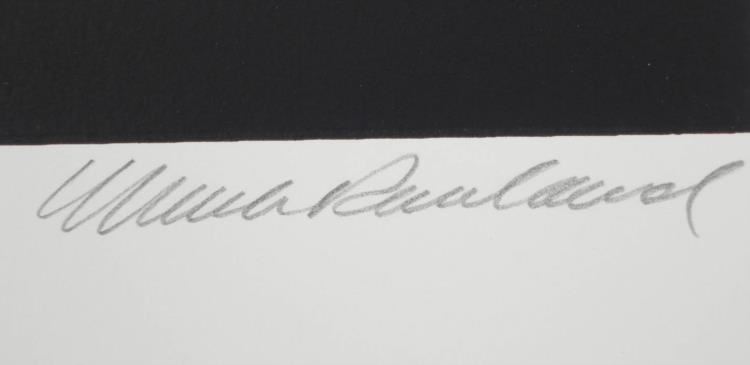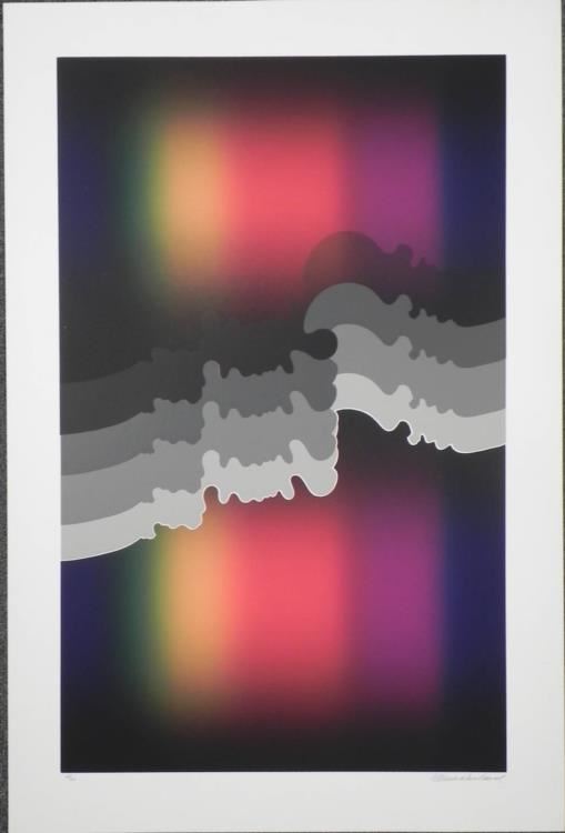 This abstract print portrays flowing gray waves over a dark background illuminated by two prism rainbows. Artist: Mark RowlandSignature: In pencil, lower rightMedium: Serigraph on paperEdition: Numbered 44/300Sheet size: 38 x 26 inchesCondition: Excellent Biography: Mark Rowland (1953- ) was exposed to art at an early age since his father, Frank Rowland, was an artist. He developed his own unique style of Serigraph Printmaking, creating soft, flowing shades of colors in bold geometric patterns. He is admired as a master printmaker. His work has been in many galleries, including Circle Gallery, Los Angeles, and Walton Street Gallery Chicago. It can be found in many public collections as well, including IBM Corporation, and Arthur Andersen Co.