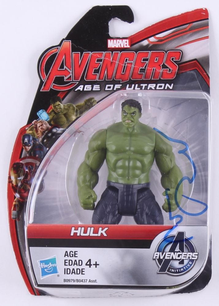 Hasbro Marvel Avengers Hulk action figure in original package. Action figure measures approximately 5" in height and has been hand-signed on the package in blue felt-tip pen by Mark Ruffalo.