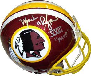 Mark Rypien is one of five players to throw for at least 300 yards in his first NFL game and also has the distinction of becoming the first Canadian-born player to receive the Super Bowl MVP in the Redskins' Super Bowl XXVI victory. In his 11 NFL seasons, Rypien completed 1,466 of 2,613 passes for 18,473 yards and 115 touchdowns, with 88 interceptions. He also rushed 127 times for 166 yards and 8 touchdowns. Mark Rypien has hand autographed this Washington Redskins Authentic Helmet with XXVI MVP inscription. Certificate of Authenticity from Athlon Sports.
