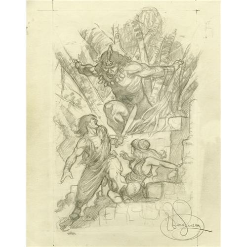<B>Mark Schultz - "Robert E. Howard's Conan of Cimmeria, Volume One" Preliminary Illustration Original Art (circa 2002).</B></I> Mark Schultz's take on the Conan character provides a refreshingly different view of the famous R. E. Howard character. This sumptuously detailed pencil preliminary drawing, drawn for the story,"The Devil in Iron," has an overall size of 9" x 11.5", and the art is in Excellent condition. <BR><BR><B>Important notice:</B> Heritage usually auctions material at the rate of 200-250 lots per hour. On some occasions eBay Live bid software or the Internet may not be able to keep up with the pace of the auction. We recommend placing a realistic absentee bid now as insurance to avoid disappointment. Occasionally the auctioneer may eliminate or reject an eBay Live bid, and the auctioneer may also reopen a lot after the close of the eBay live bidding (usually because we missed an audience bid), and may reject your bid even if it shows you as the winning bidder. By bidding via eBay Live, you agree that Heritage may award the lot to another bidder at its sole discretion under the circumstances described above or any other reasonable circumstances. Since eBay bids are not shown to us until we open the lot on the floor, we treat those bids just like floor bids. In most cases the floor responds before the eBay bid is presented to us, due to Internet lag time, so for consistency we have made it a policy that floor bids are always considered first over tie eBay live bids. Also please note that all Heritage lots purchased through eBay Live carry a 22.5% Buyer's Premium. Please make sure you read the Terms and Conditions before you bid. This lot is being auctioned in conjunction with a live floor auction by Heritage Auction Galleries. All final auction and invoice information will be supplied by Heritage Auction Galleries, and all other information should be considered preliminary. Lot:41001 <BR><BR><B>Winning Notification and Billing:</B> After the FINAL session in this auction is complete, Heritage will send e-mail and snail mail invoices. This process normally takes several days. All final auction and invoice information will be supplied by Heritage Auction Galleries, and all other information should be considered preliminary. <BR><BR>This auction will be conducted on a live auction floor and over the Internet through eBay Live. If you choose to place an absentee bid, please take a moment to <font color='#0000ff'><u><a href='http://pages.ebay.com/liveauctions/help/before/laabsentee.html'>learn how eBay Live absentee bidding works</a></u></font><font color='#000000'>