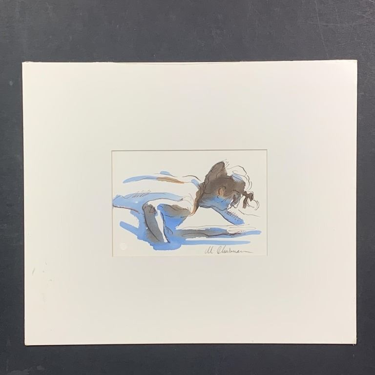 Mark Thurman, Unknown Title, Original Watercolor on Paper. This piece depicts a woman, leaning forward in a pool of water. It is matted and sealed in plastic. This piece is in excellent condition.