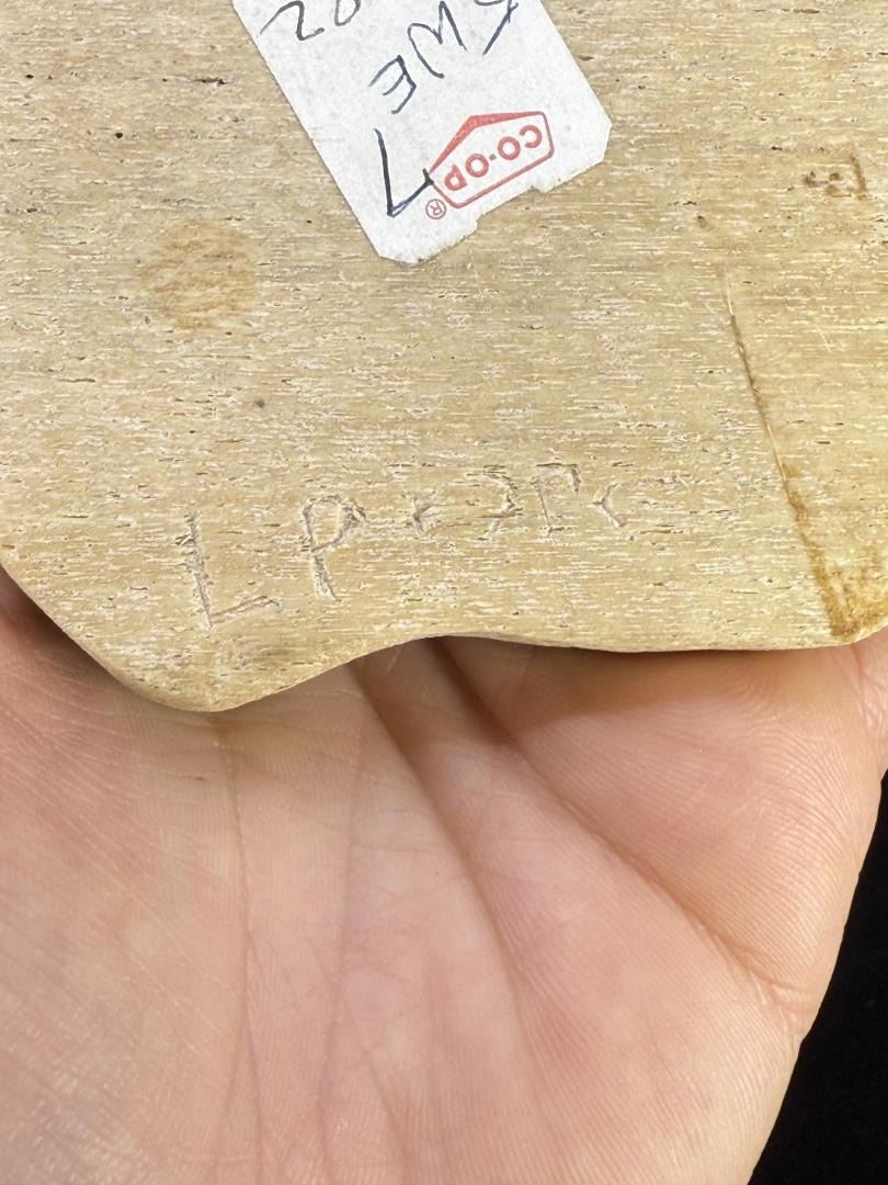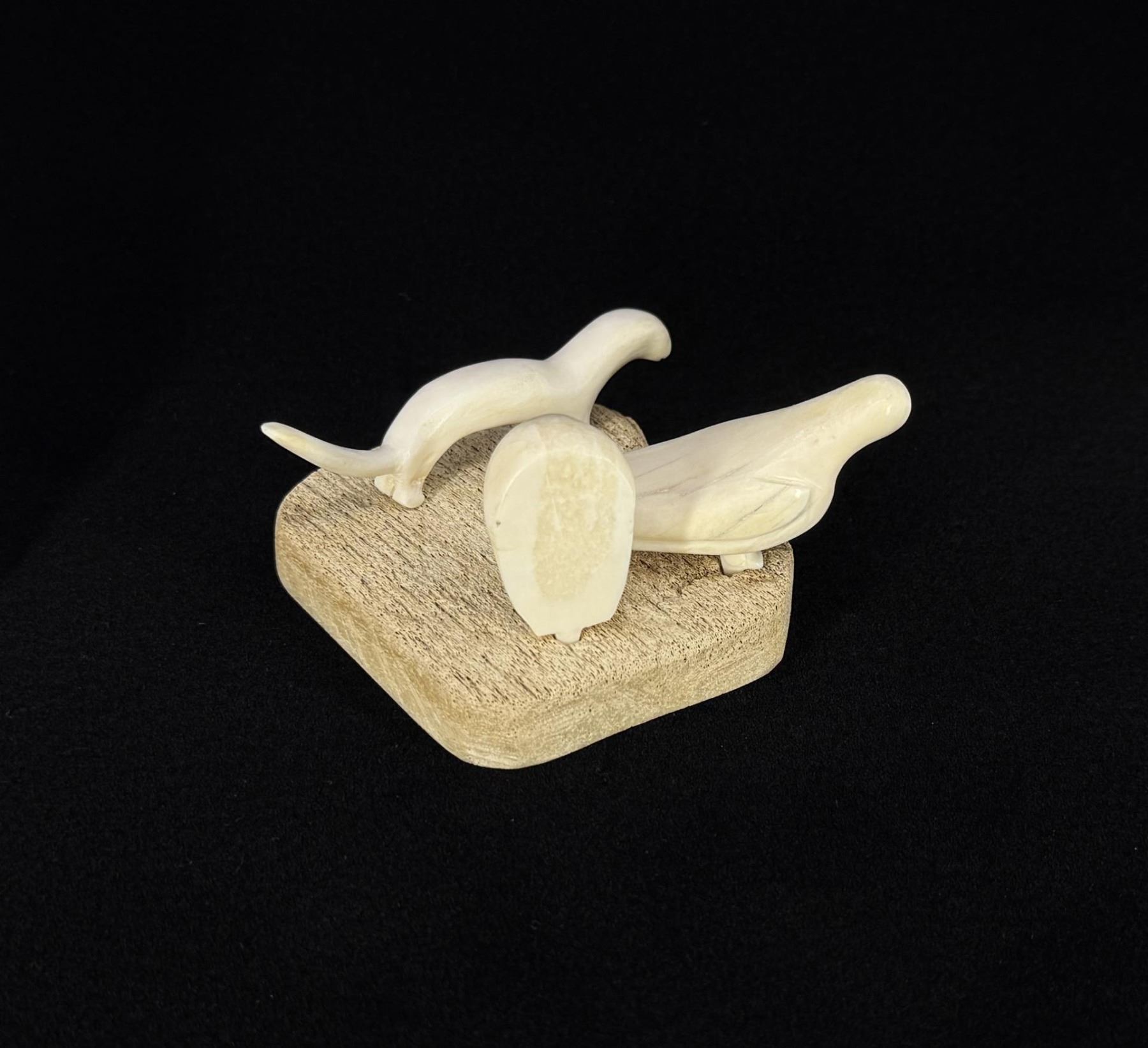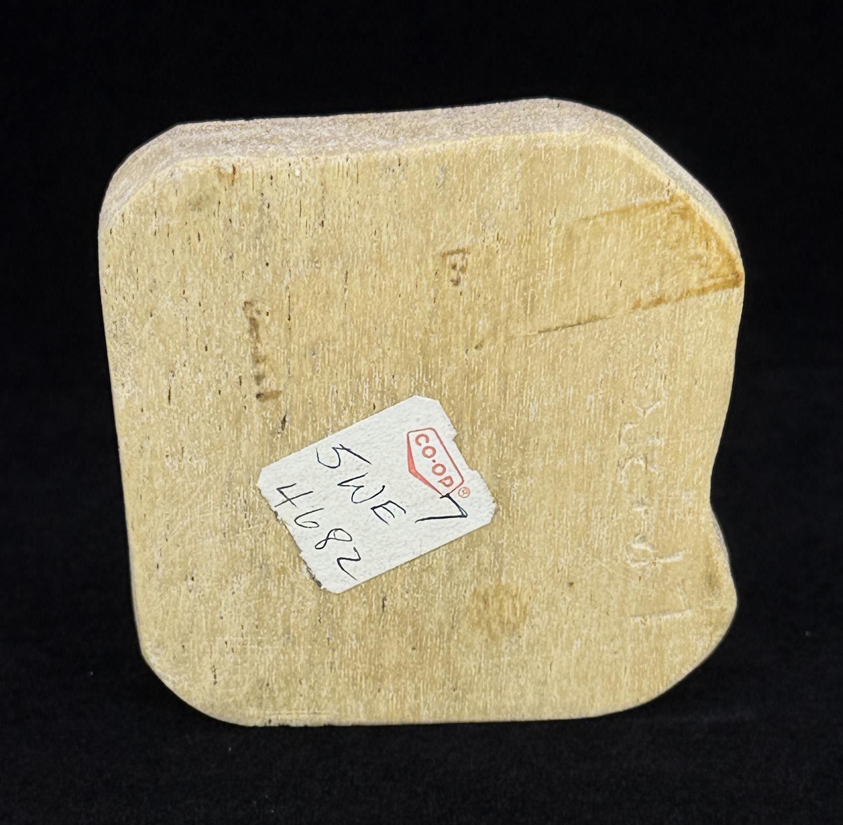 3 3/8" by 3 1/4" by 1 3/4". Carved Walrus Ivory and Whale Bone. Native made prior to 1972. This item cannot be shipped to Oregon, California, Hawaii, New York, New Jersey, Internationally, or any other state that prohibits. Provenance: Heard Museum, Arizona; Private Collection, New York.