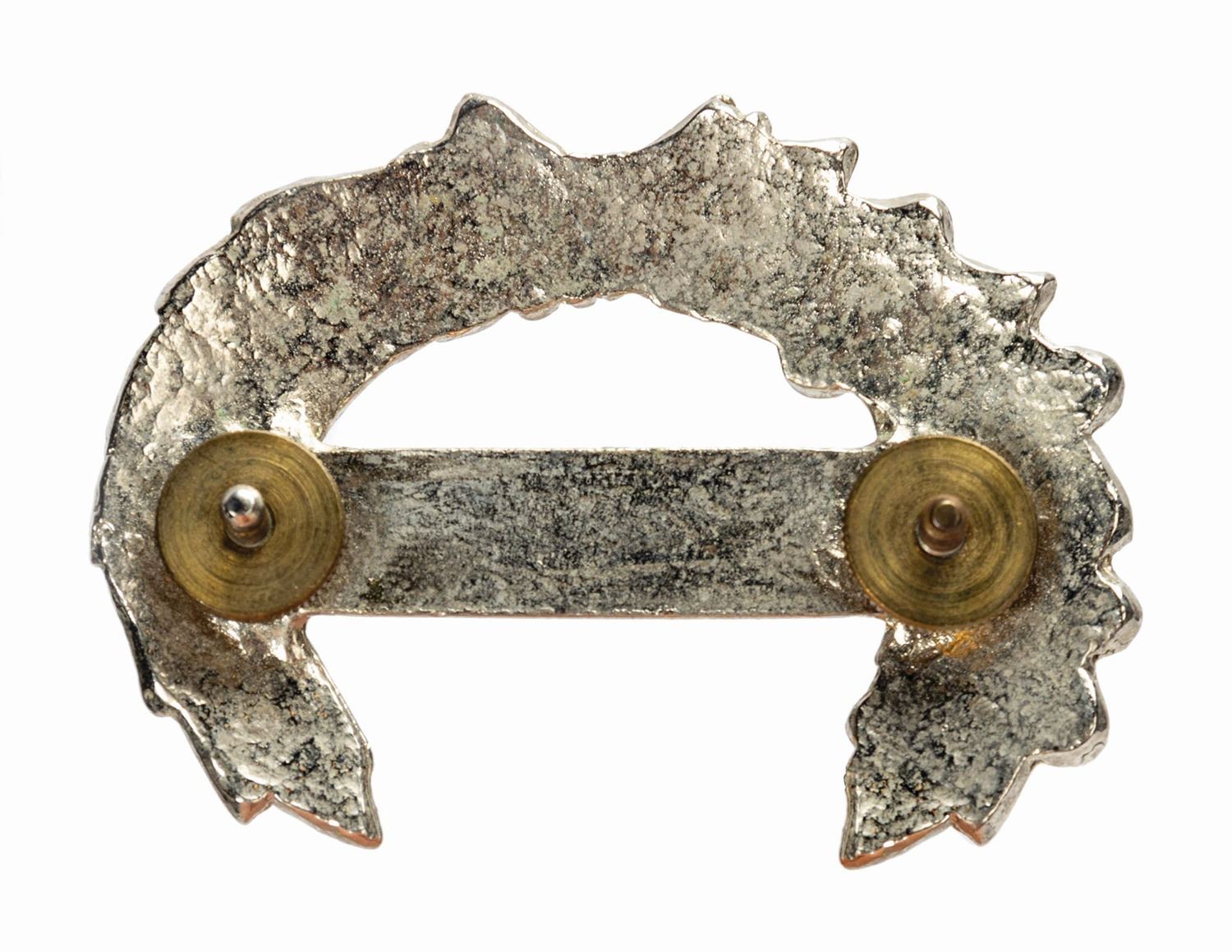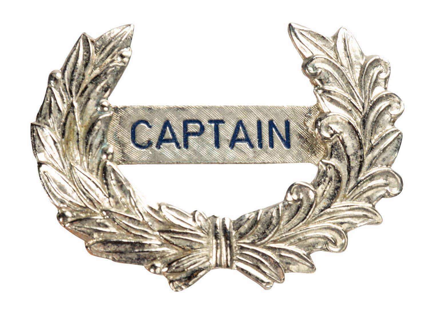 (Disneyland, c.1980s) A very rare badge worn by cast members working on the Mark Twain Riverboat at Disneyland. This metal badge features the designation of "Captain" and was worn on the costume hats. Measuring 2"x2.75", the badge is in very good condition with some light surface wear to the silver coating from age and use.